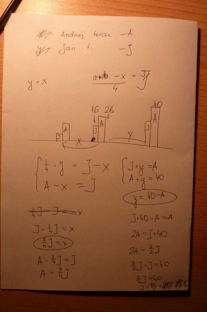 Gdy Jan zapytał Andrzeja ile ma lat usłyszał taką odpowiedź : "Gdy ja byłem w twoim wieku byłeś ode mnie 4 razy młodszy. Gdy Ty będziesz w moim wieku będę miał 40 lat". Ile lat ma obecnie każdy z nich?