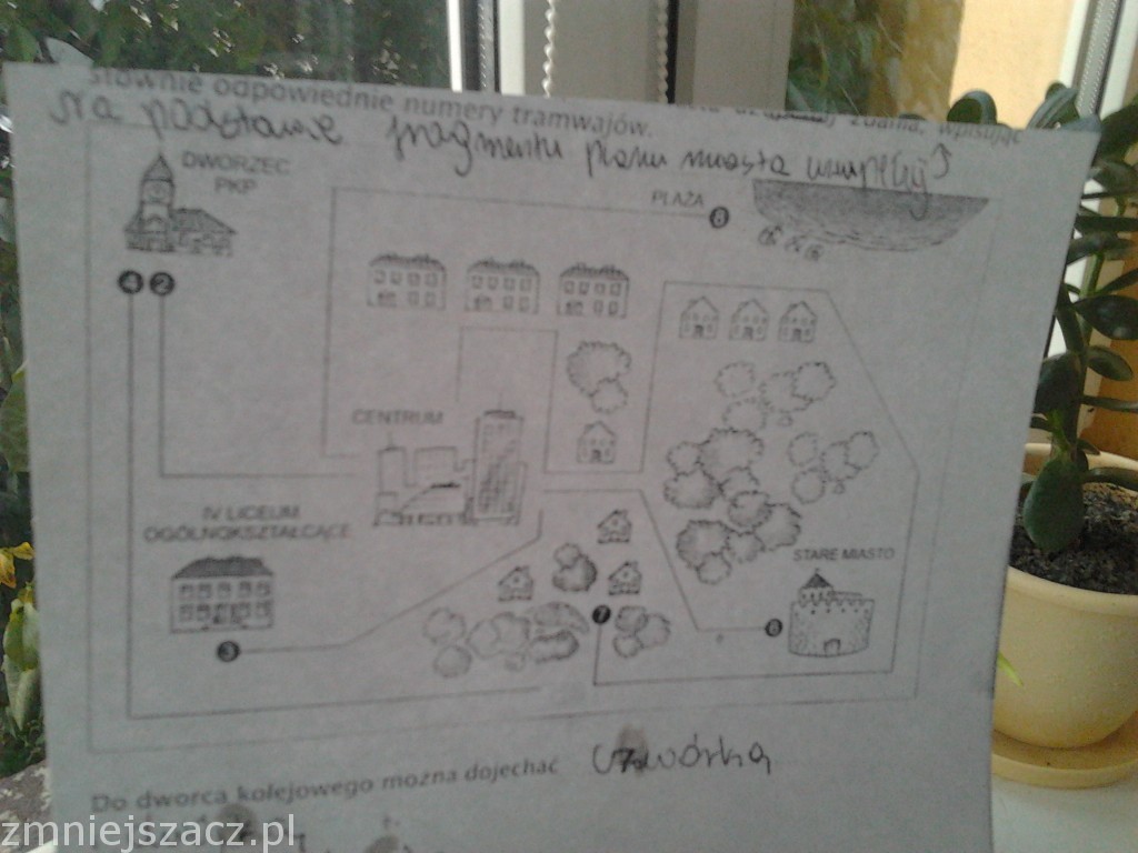 Na podstawie fragmentu planu miasta uzupełnij zdania, wpisujac słownie odpowiednie numery tramwajów .