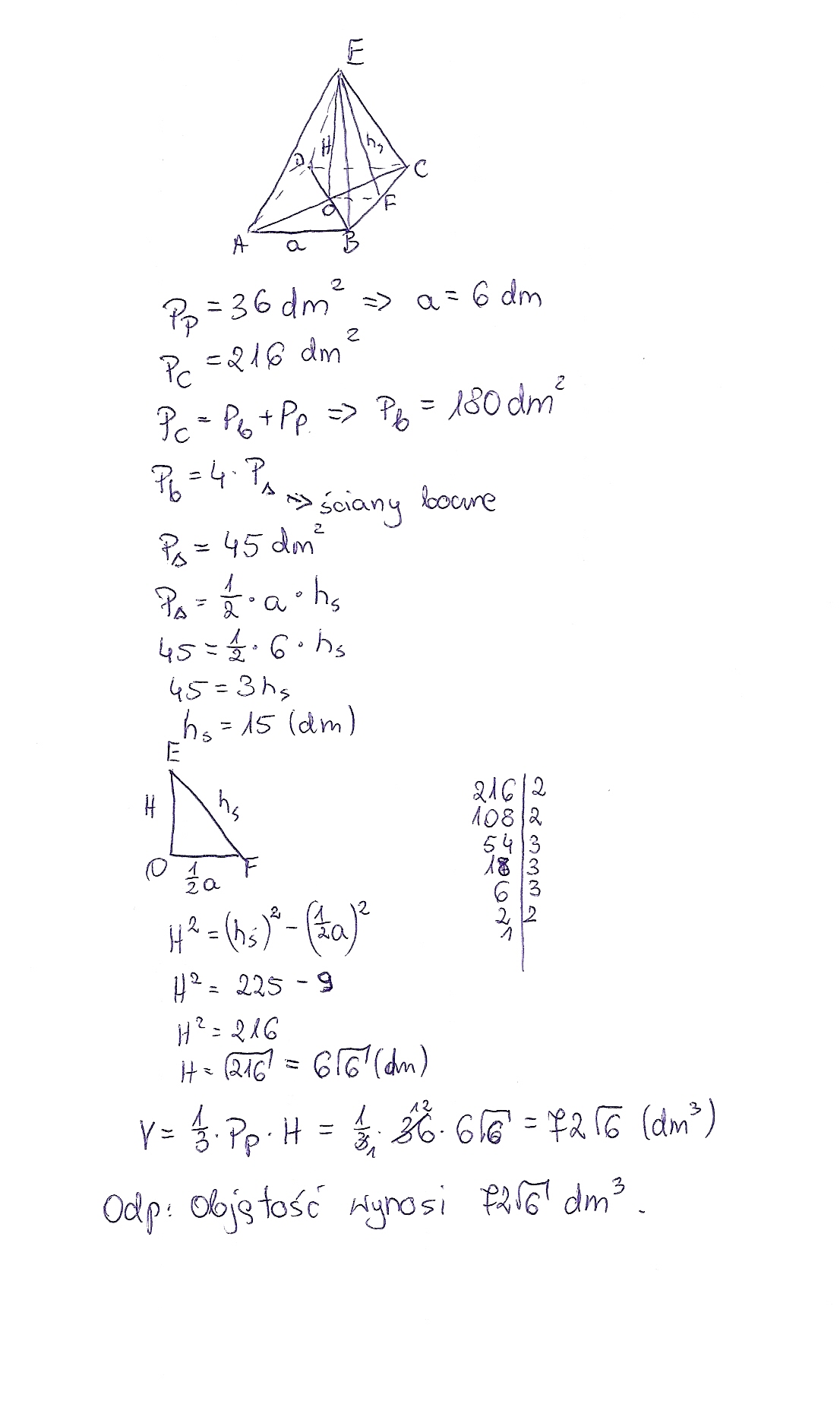 oblicz objętośc ostrosłupa prawidłowego czworokątnego wiedząc ze pole podstawy wynosi 36 dm kwadr a pole powierzchni całkowitej 216 dm kwadt