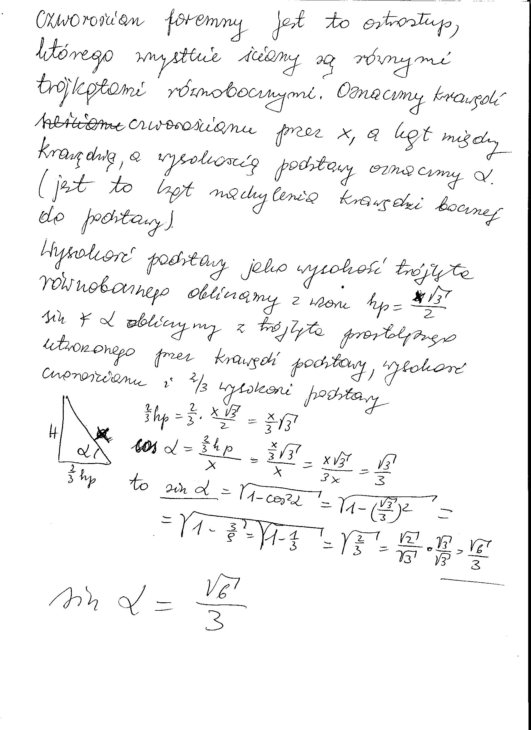 oblicz sinus kata nachylenia krawedzi bocznej do płaszczyzny podstawy w czworościanie foremnym.