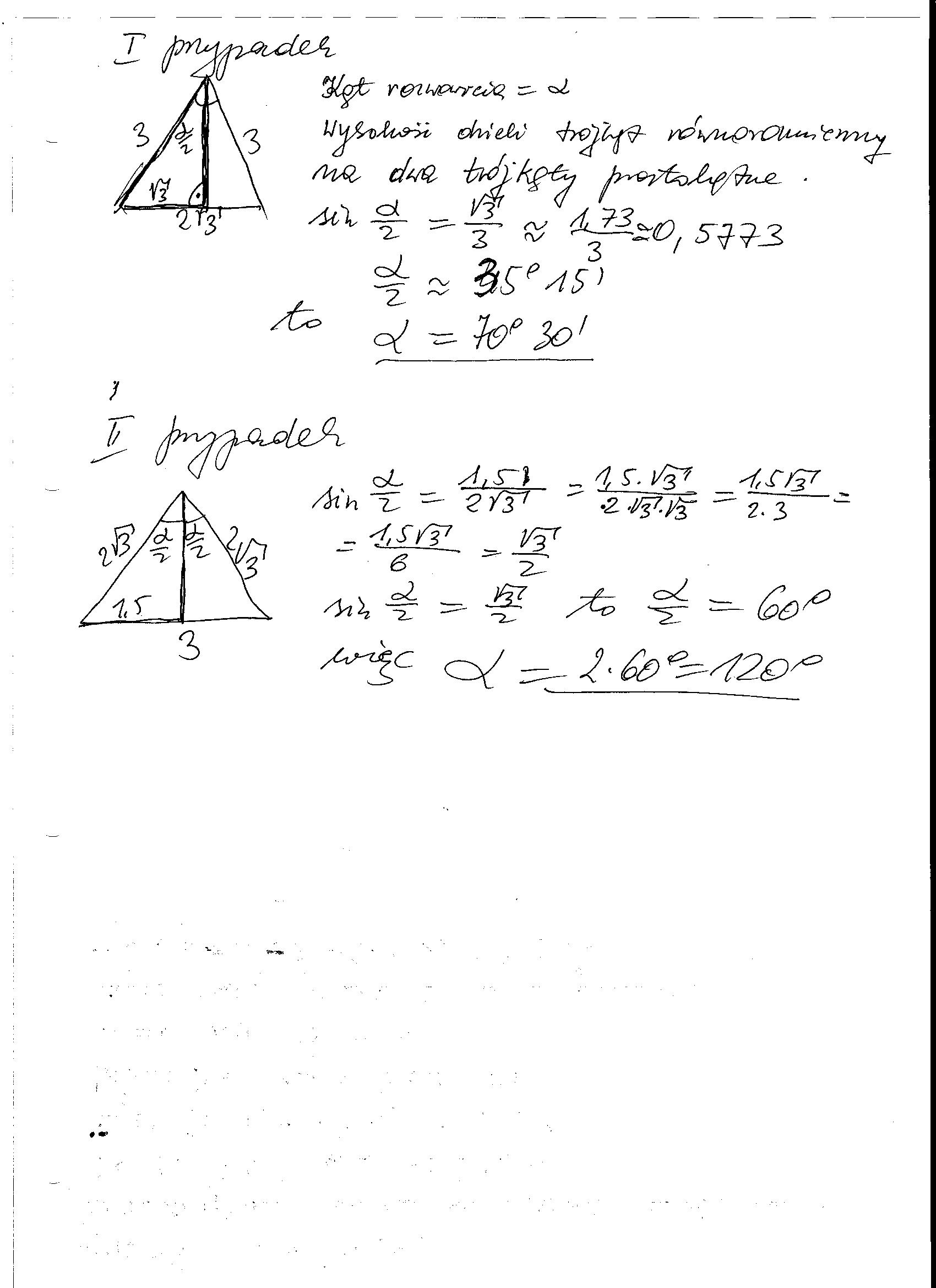 przekrój osiowy stożka jest trojkątem rownoramiennym o bokach dł 3 i 2 pierw z 3 . oblicz miare kata rozwarcia stożka , rozpatrz 2 przypadki.