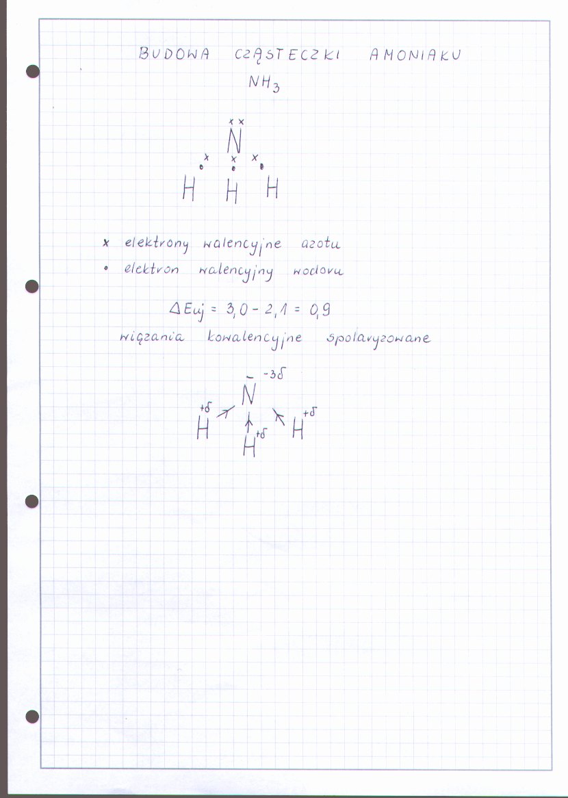 Narysuj wzór elektronowy cząsteczki amoniaku, określ rodzaj i typ występującego wiązania chemicznego i kształt cząsteczki.