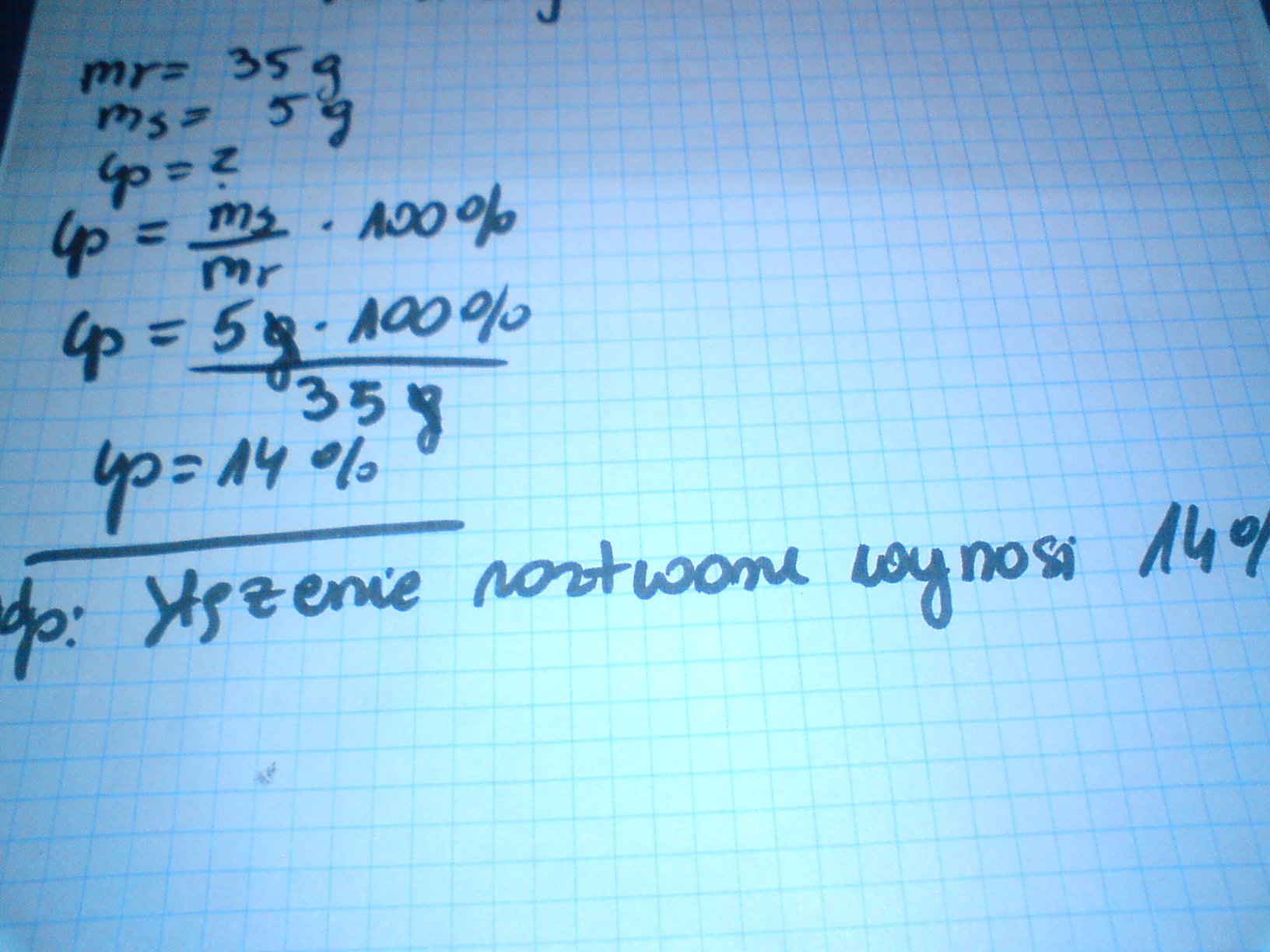 5 g cukru rozpuszczono w 30 g wody. Oblicz stezenie roztworu.