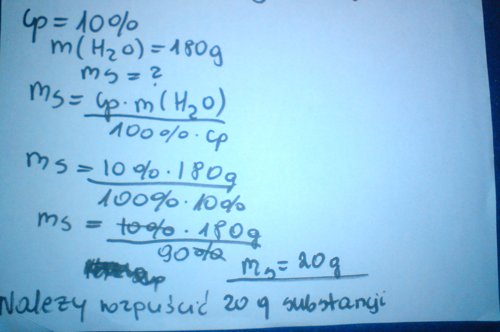 ile g substancji nalezy rozpuscic w 180 g wody aby otrzymac roztwor 10 % ?