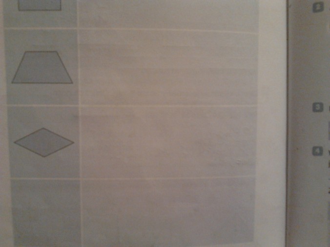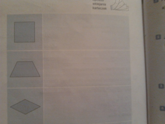 Na s. 103 na karteczkach wypisane są własności 4 czworokątów w tym trzech przedstawionych na rysunkach w tabeli. Niektóre własności wypisane są więcej niż jeden raz, bo są własnościami więcej niż jednej figury. Wytnij karteczki i wklej je w odpowiednie miejsca w tabeli jedna pod drugą 9patrz rysinek). Niektóre karteczki nie zxostaną wykorzystane. Są na nich własności figury, ktorej nie narysowano. Odgadnij, jaka to figura. Narysuj ją i wklej karteczki z jej własnościami.