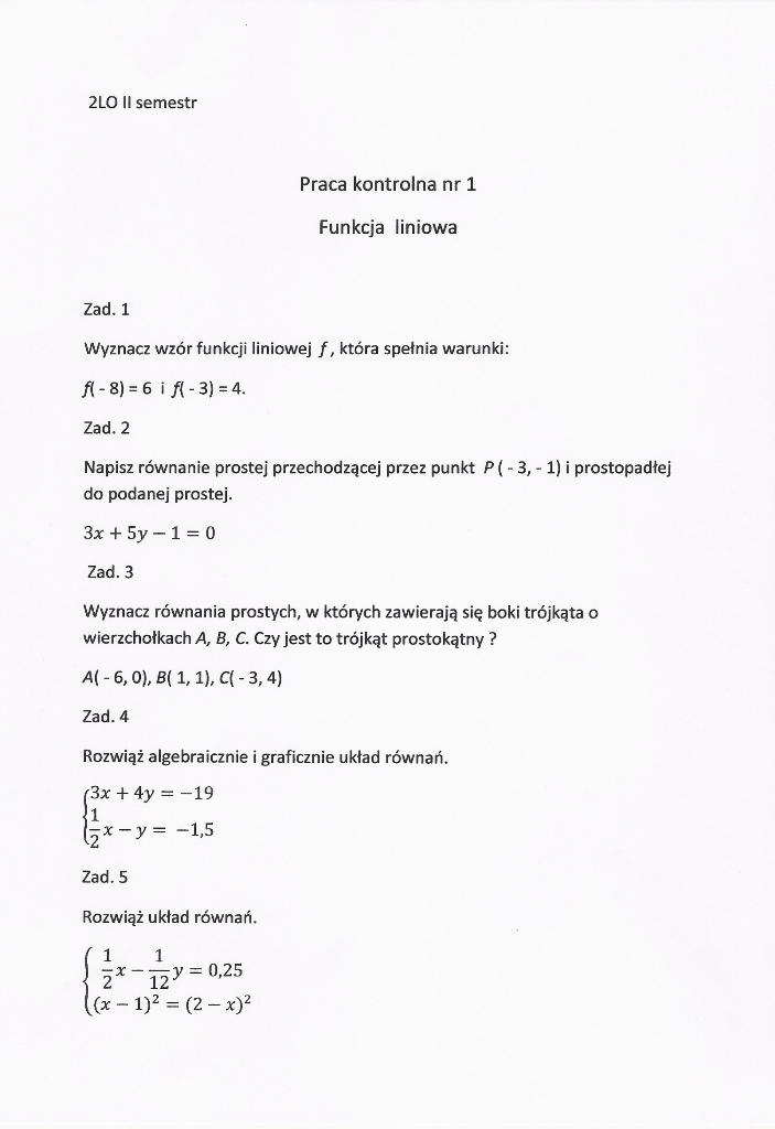 Bardzo proszę o rozwiązanie pracy kontrolnej z matematyki. muszę ją oddać do 10 listopada