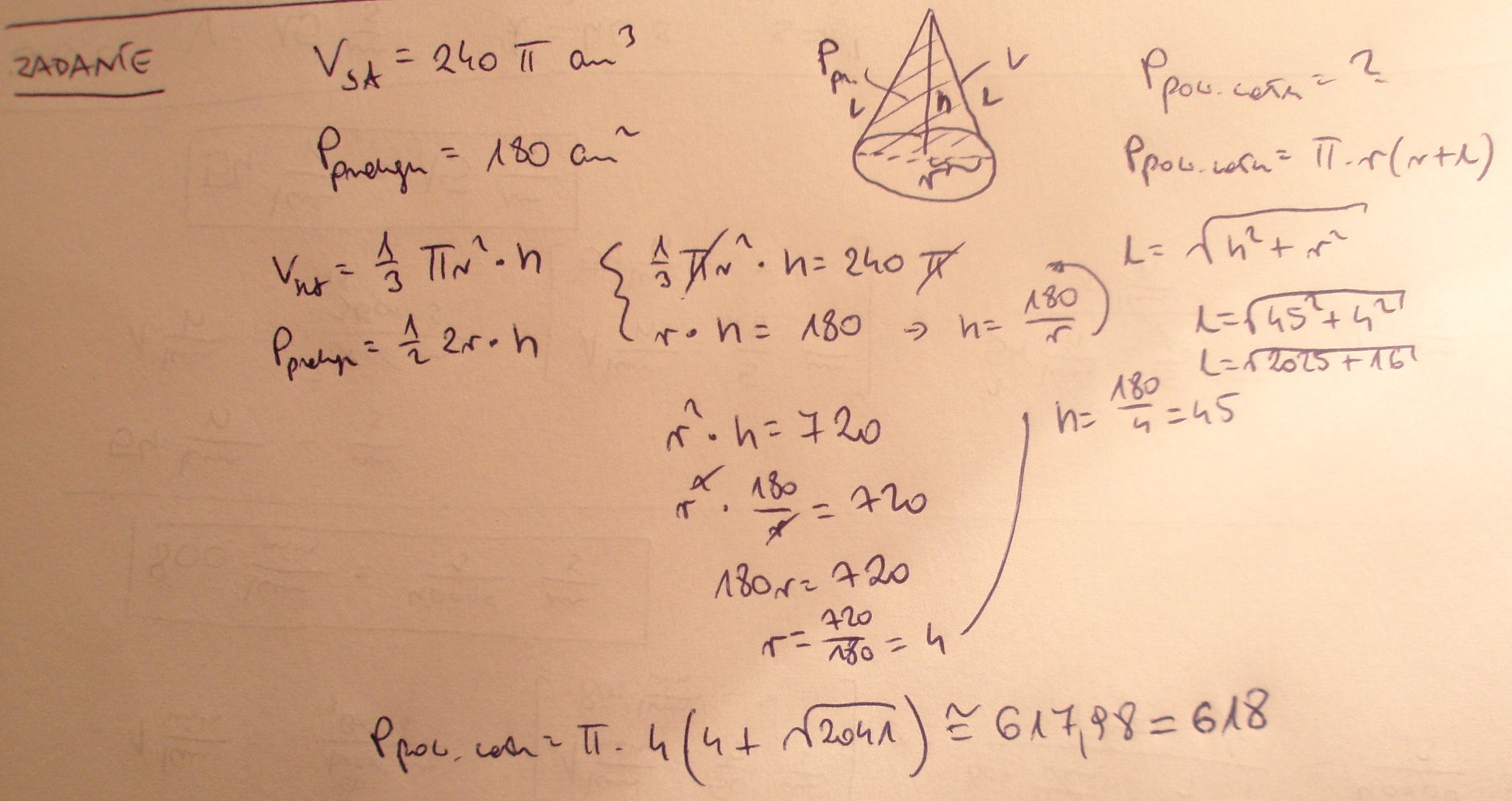 Objętość stożka wynosi 240II ( pi) cm sześciennych,a pole jego przekroju osiowego równa się 180cm kwadratowych.Oblicz pole powierzchni całkowitej stożka (z dokładnościa do całości )