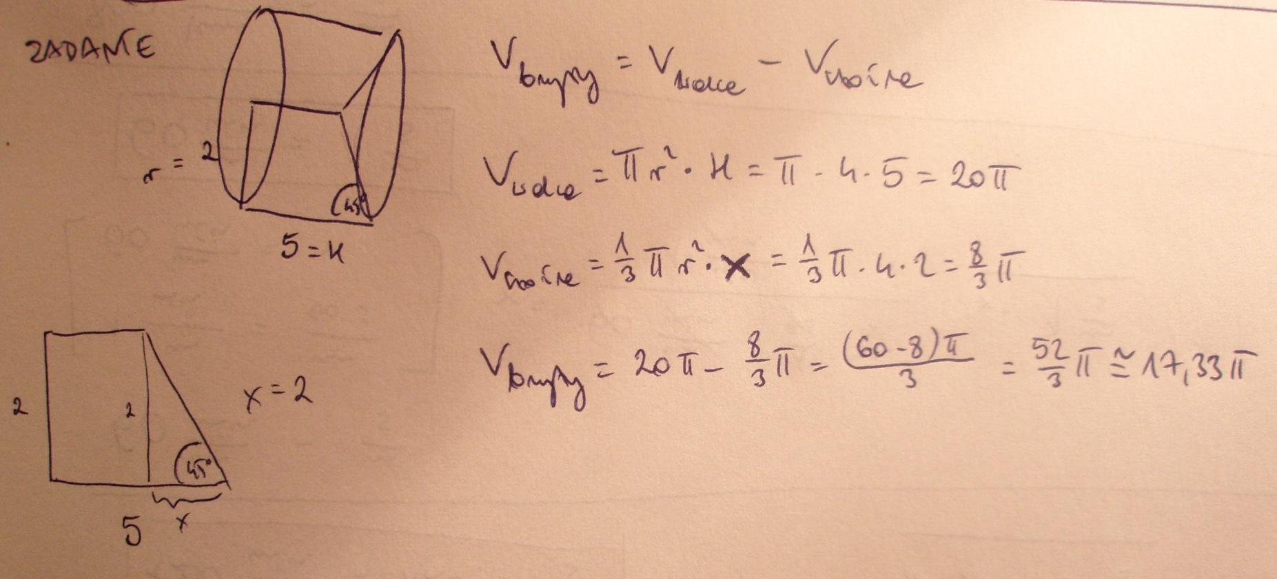 Trapez prostokątny o wysokości 2cm,dłuższej podstawie równej 5cm i kącie ostrym 45 stopni,obraca się dookoła prostej zawierającej krótszą podstawę.Oblicz objętość otrzymanej w ten sposób bryły.