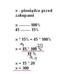 x= 100% * 45 zł / 15 % ( procenty się skrócą, jako jednostka pozostaną zł)