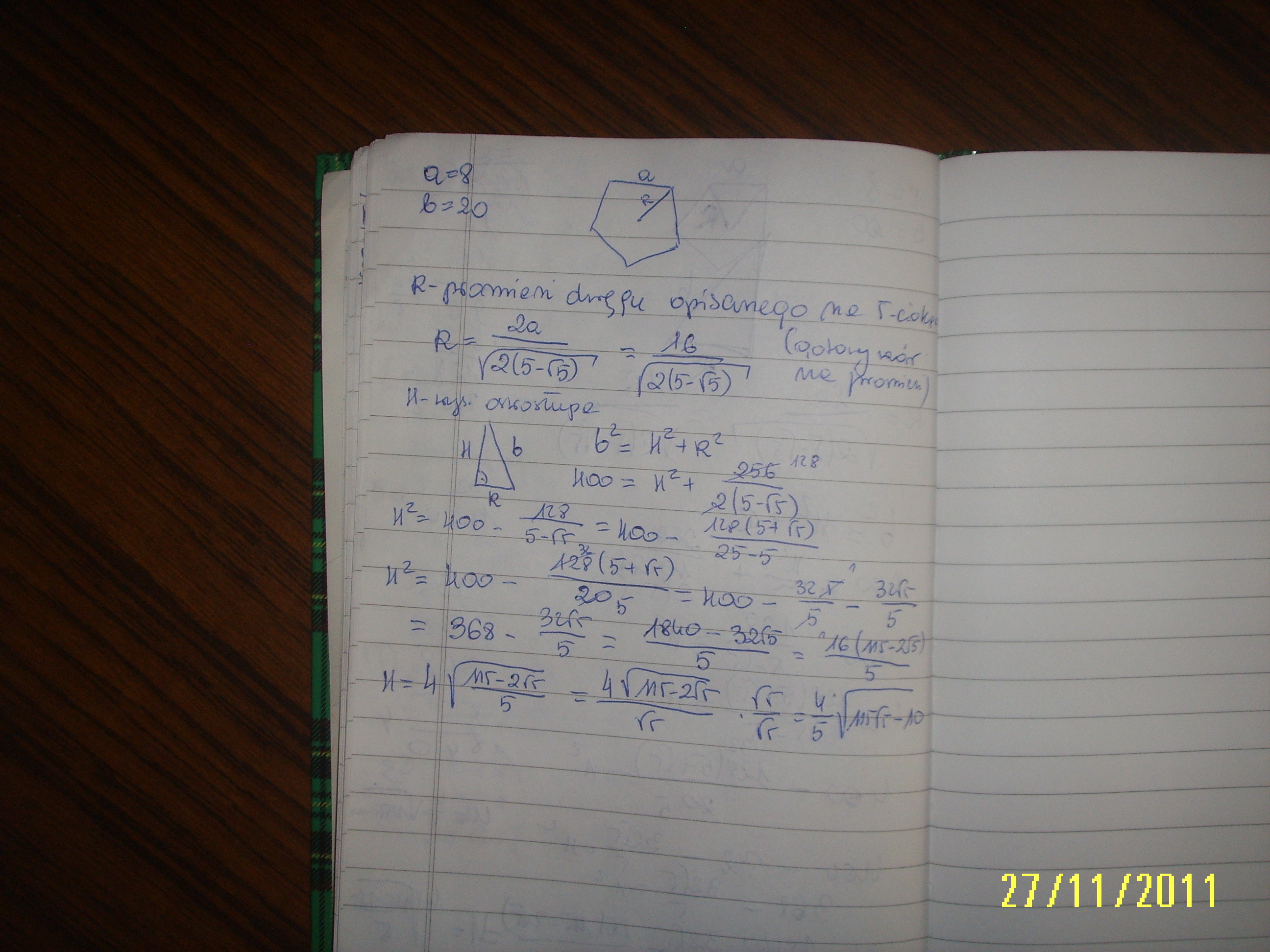 Oblicz wysokość ostrosłupa pięciokątnego mając daną dł krawędzi podstawy a=8 oraz dł krawędzi bocznej b=20