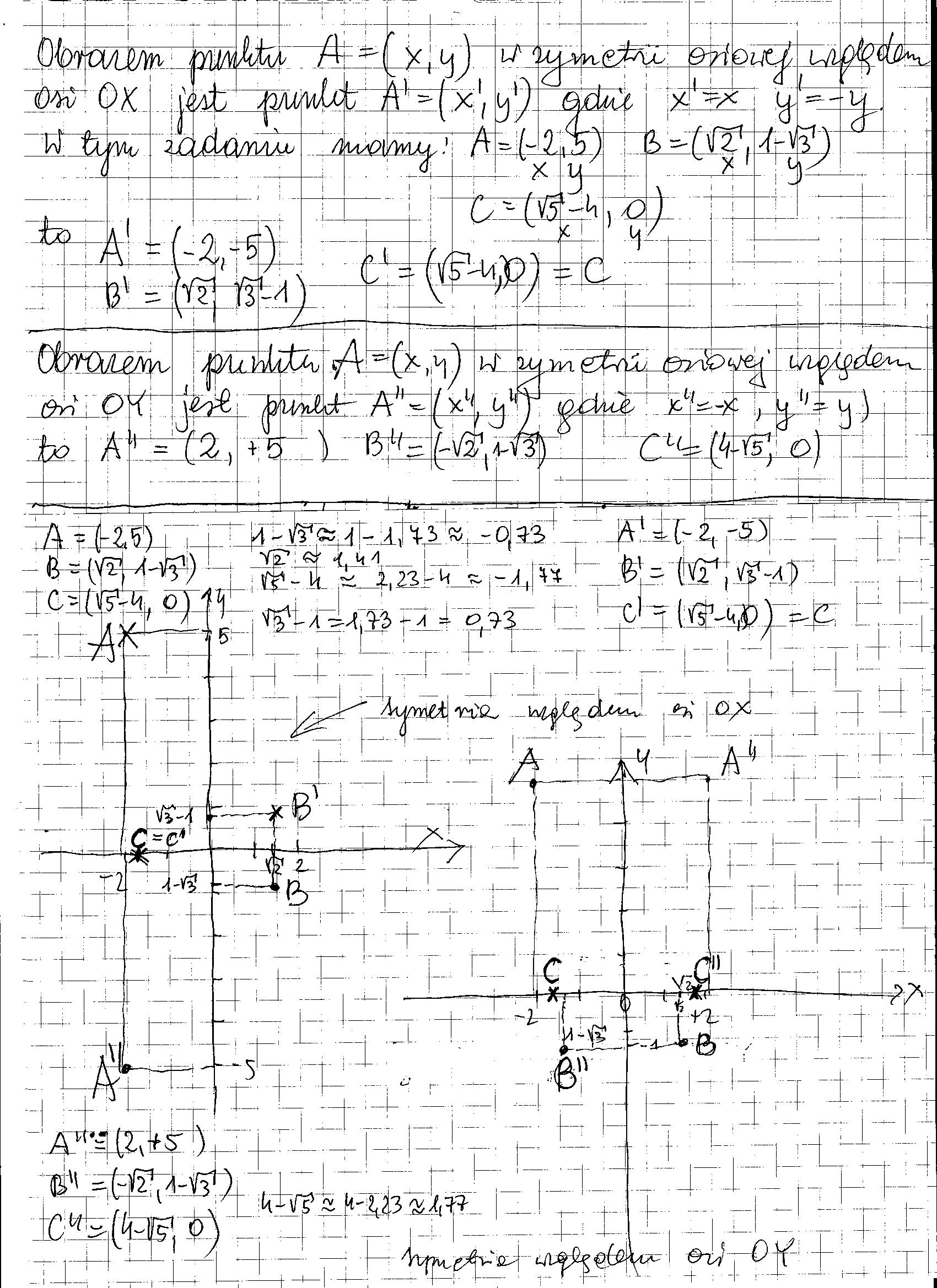 Znajdź obrazy punktów A=( -2,5) B( pierwiastek z 2, 1- pierwiastek z 3), C( pierwiastek z pięciu-4,0) w symetrii osoiowej względem osi x oraz w symetrii względem osi y)