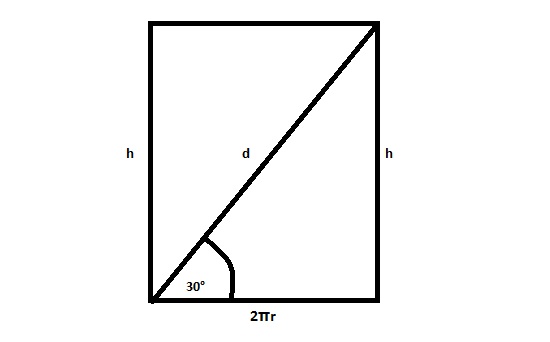 zad.2 Powierzchnia boczna walca po rozwinięciu jest prostokątem, którego przekątna o długości 4cm tworzy z bokiem równym wysokości walca kąt o mierze 30°. Oblicz pole powierzchni całkowitej i objętość walca.