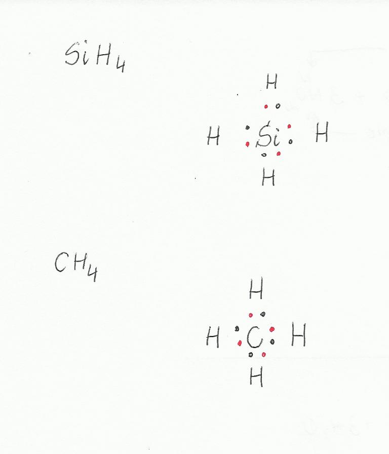 Atomy Si i C mają po 4 elektrony własne + 4 uwspólnione z atomów wodoru - czyli uzyskują oktet elektronowy.