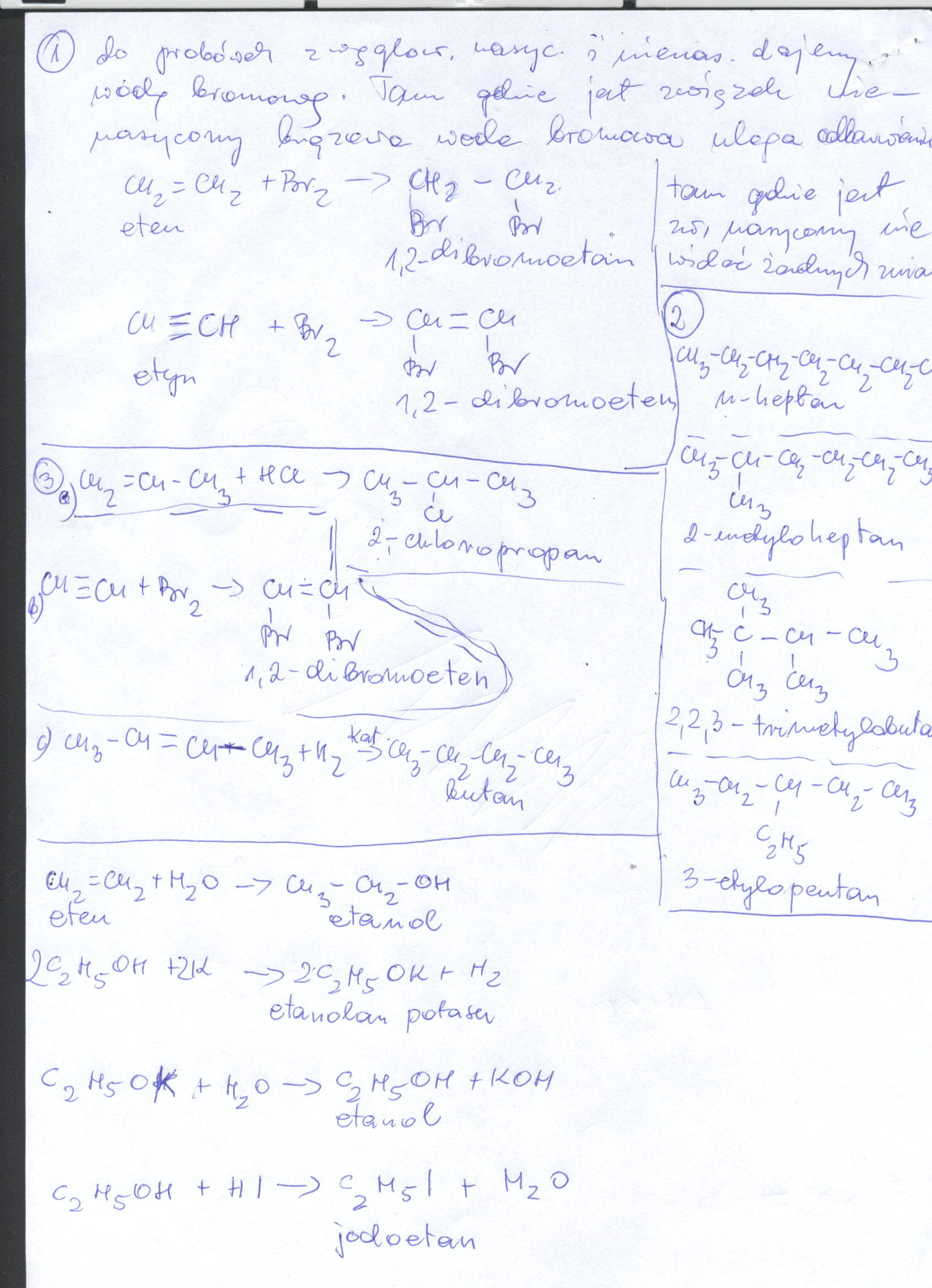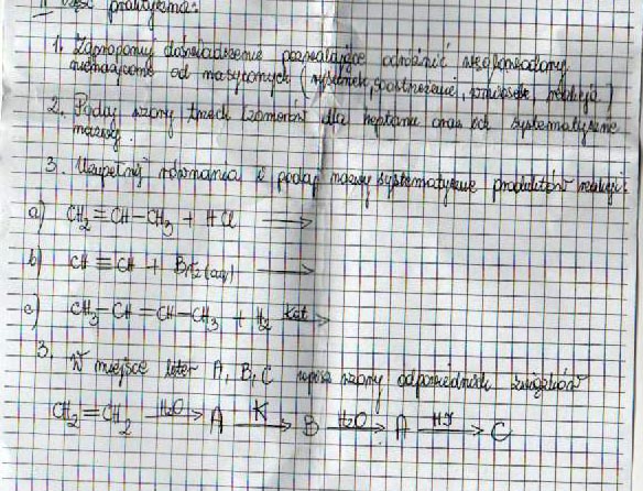 Do probówek z próbkami dodajemy wody bromowej i wstrząsamy.W probówce,w której nastąpi odbarwienie wody bromowej jest węglowodór nienasycony (z wiązaniem podwójnym lub potrójnym).