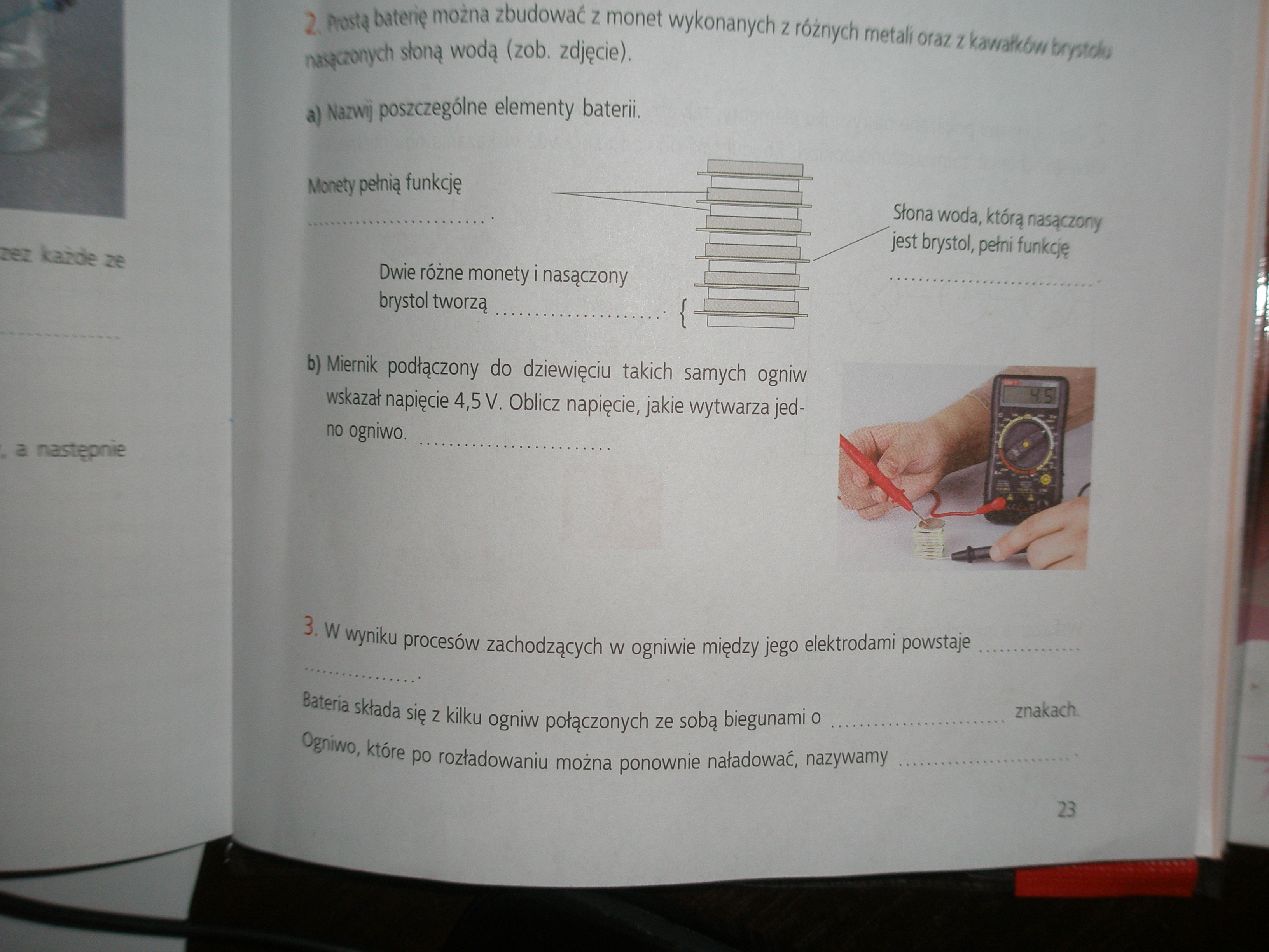 a) Monety pełnią funkcję - ELEKTROD Słona woda - ELEKTROLITU Dwie rózne monety + nasaczony bristol tworza OGNIWO b) 4,5V : 9 = 0,5V 3) W wyniku procesów zachodzacych w ogniwie ......powstaje RÓŻNICA POTENCJAŁÓW ,czyli NAPIĘCIE. Bateria............o PRZECIWNYCH znakach. Ogniwo,które można ponownie naładować - AKUMULATOR.
