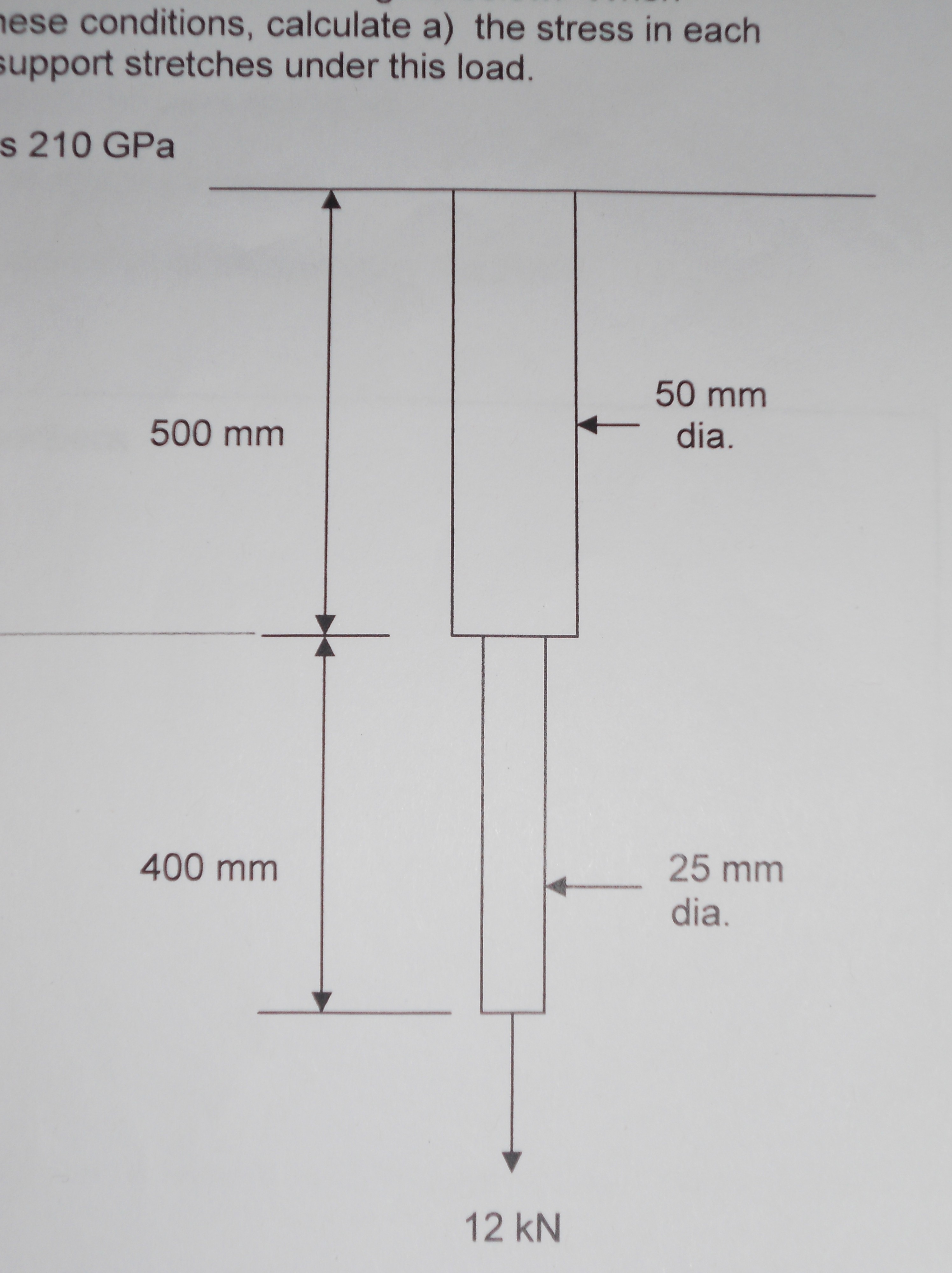 a) the stress in each section of the support