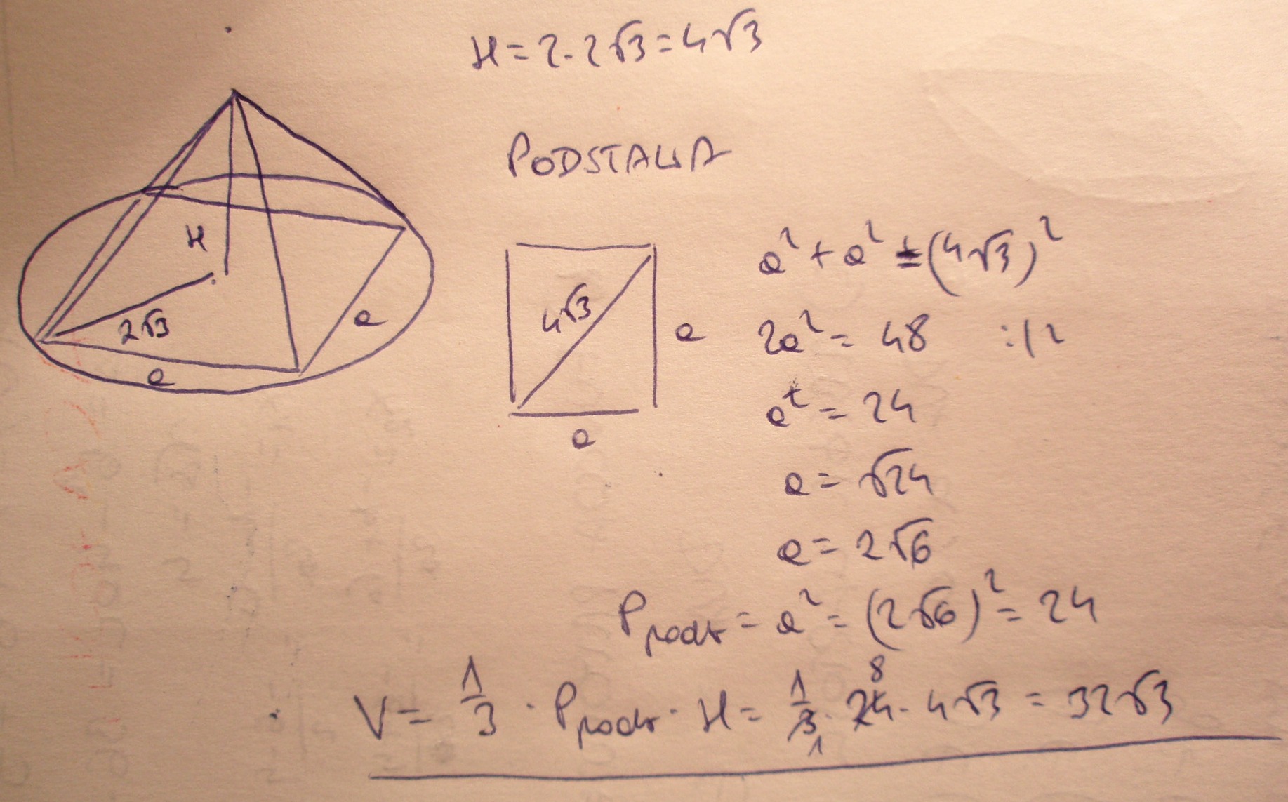 Dany jest ostrosłup prawidłowy czworokątny o promieniu okręgu opisanego na podstawie2 pierwistki z trzech i wysokości dwa razy większej . Oblicz objętość tego ostrosłupa?