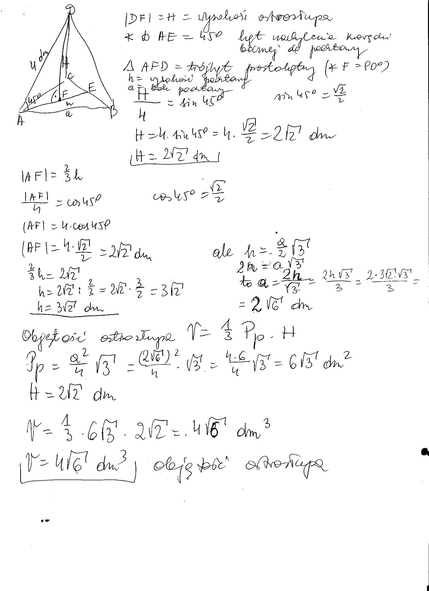 Oblicz objętość ostrosłupa prawidłowego trójkątnego, w którym krawędź boczna ma 4dm i jest nachylona do podstawy pod kątem 45 stopni.