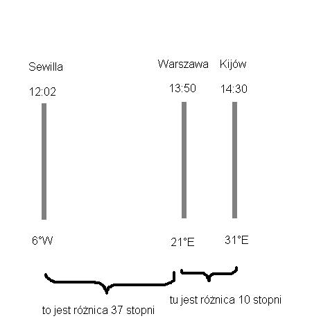 Oblicz która godzina czasu s. m. jest w Warszawie (21stopni E) gdy w Kijowie (31stopni E) jest 14:30. Ktora w tym czasie jest w Sewilli (6stopni W)