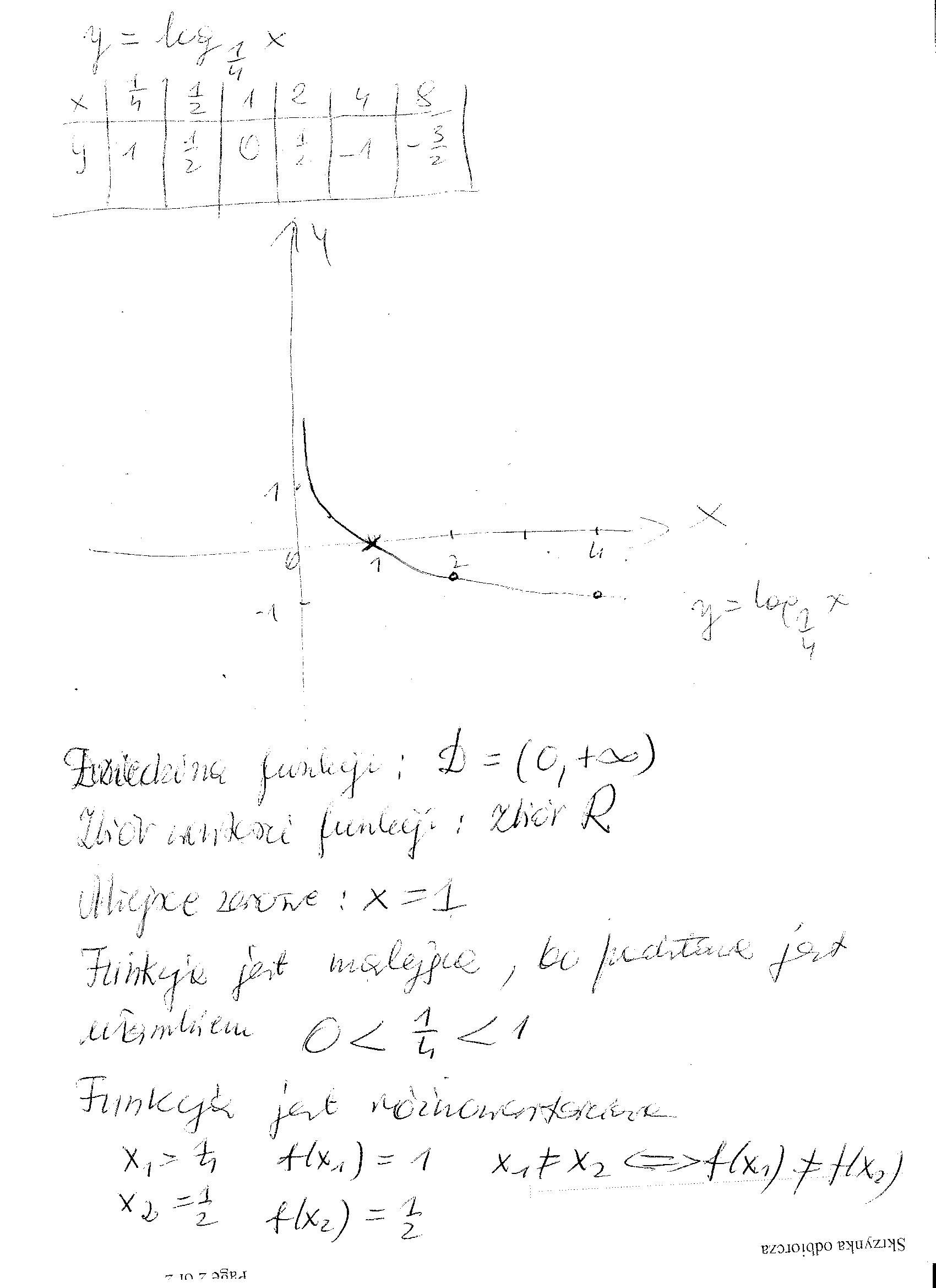 W prostokątnym układzie współrzędnych naszkicuj wykres funkcji f(x) = log 1/4 x omów jej własności