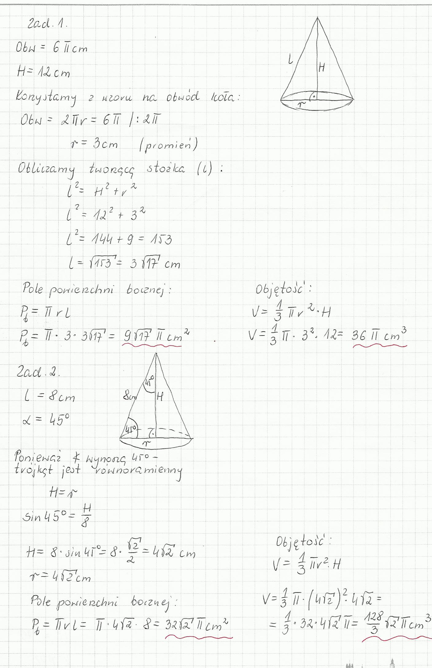 Tworząca stożka jest równa 8 cm i jest nachylona do płaszczyzny podstawy pod kątem 45 stopni . Zrób rysunek pomocniczy oraz oblicz pole powierzchni bocznej o objetość tego stozka.