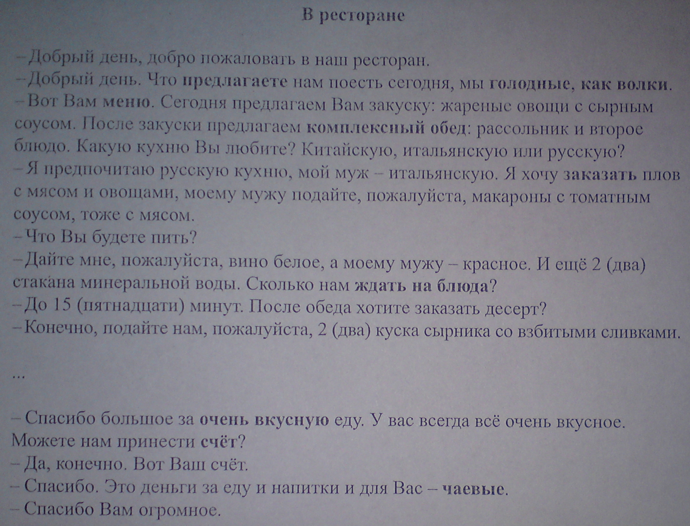 -JA proponuję kuchnię rosyjską, mój mąż włoską. JA chcę zamówić pilaw z mięsem i warzywami, mężowi proszę podać makaron z sosem pomidorowym i mięsem.