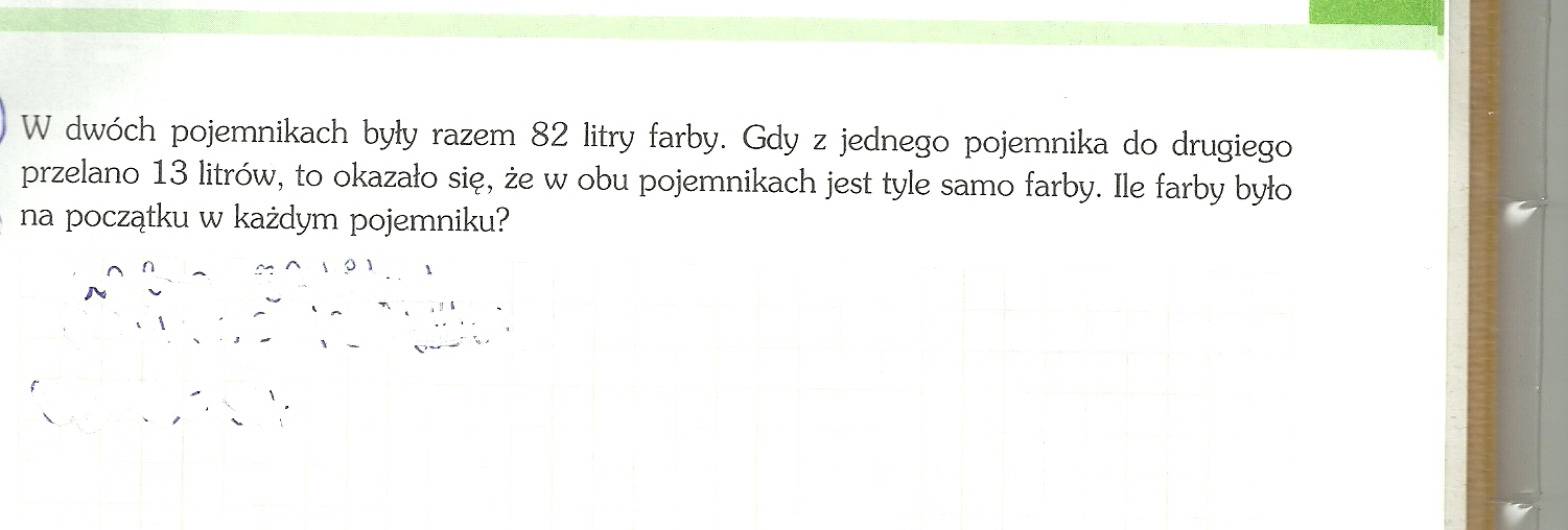 Odp.: W 1-wszym pojemniku bylo na poczatku 28l farby a w drogim 54l.