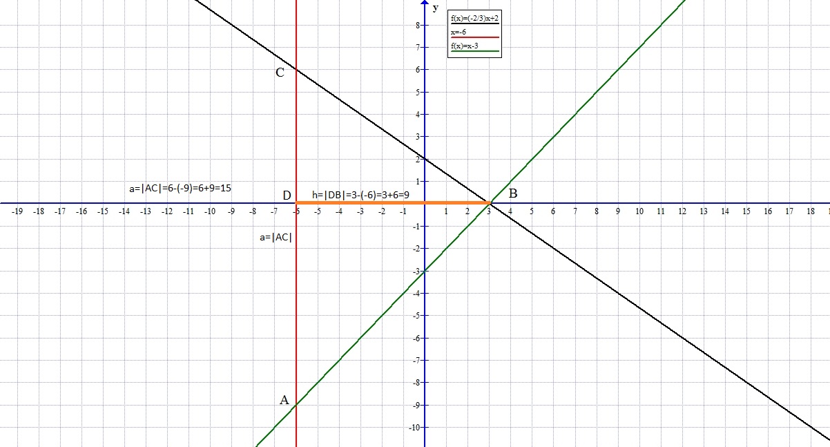 Boki trojkata ABC sa zawarte w prostych o rownaniach x= -6, 2x+3y-6=0, -x+y+3= 0. Narysuj ten trojkat w ukladzie spolrzednych i oblicz jego pole. proszę o pomoc wytlumaczenie dokladne.