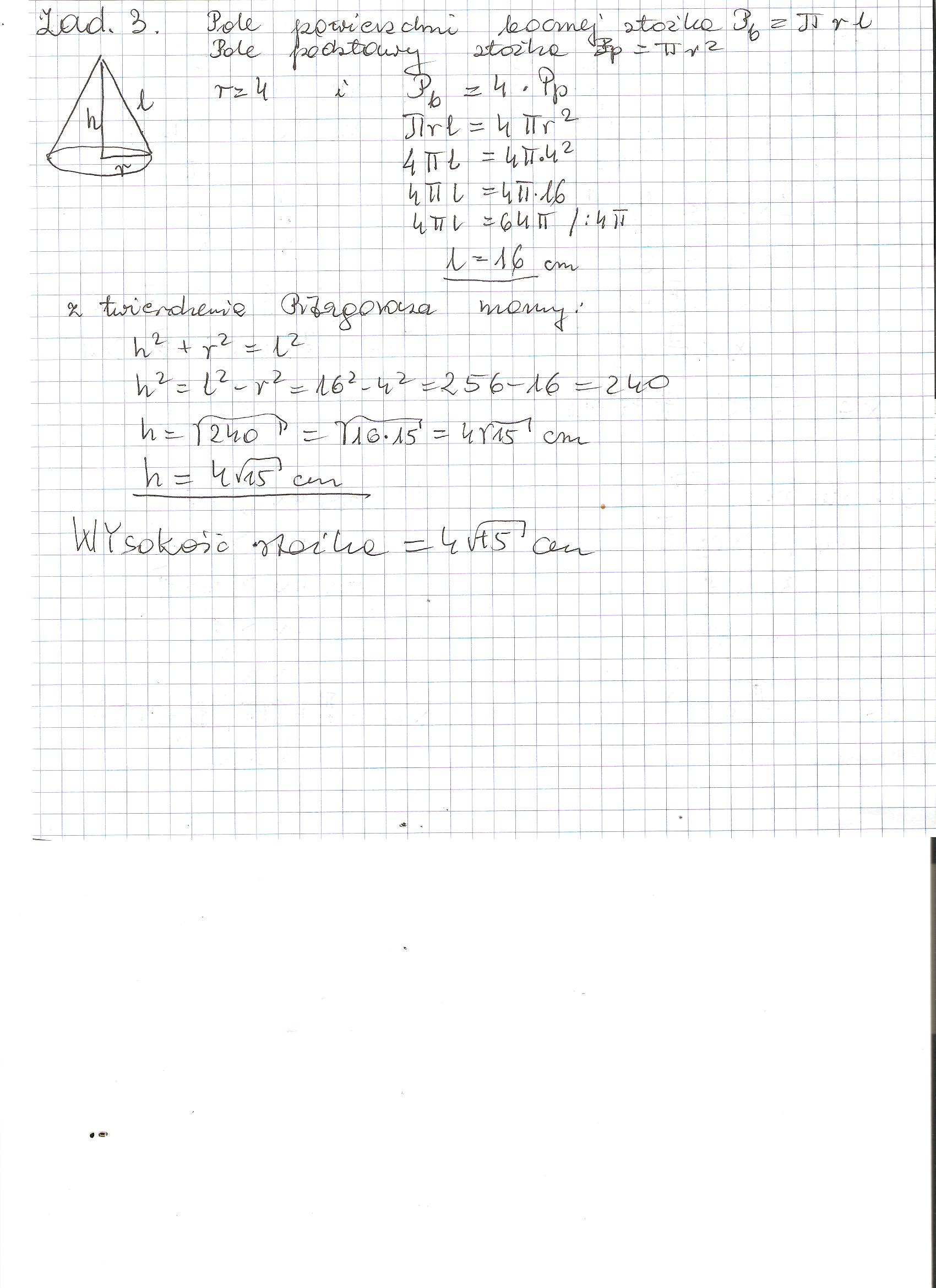Pole powierzchni bocznej stożka jest czterokrotnie większe od pola podstawy stożka.Oblicz wysokość stożka wiedząc,że promień jego podstawy jest równy r=4.