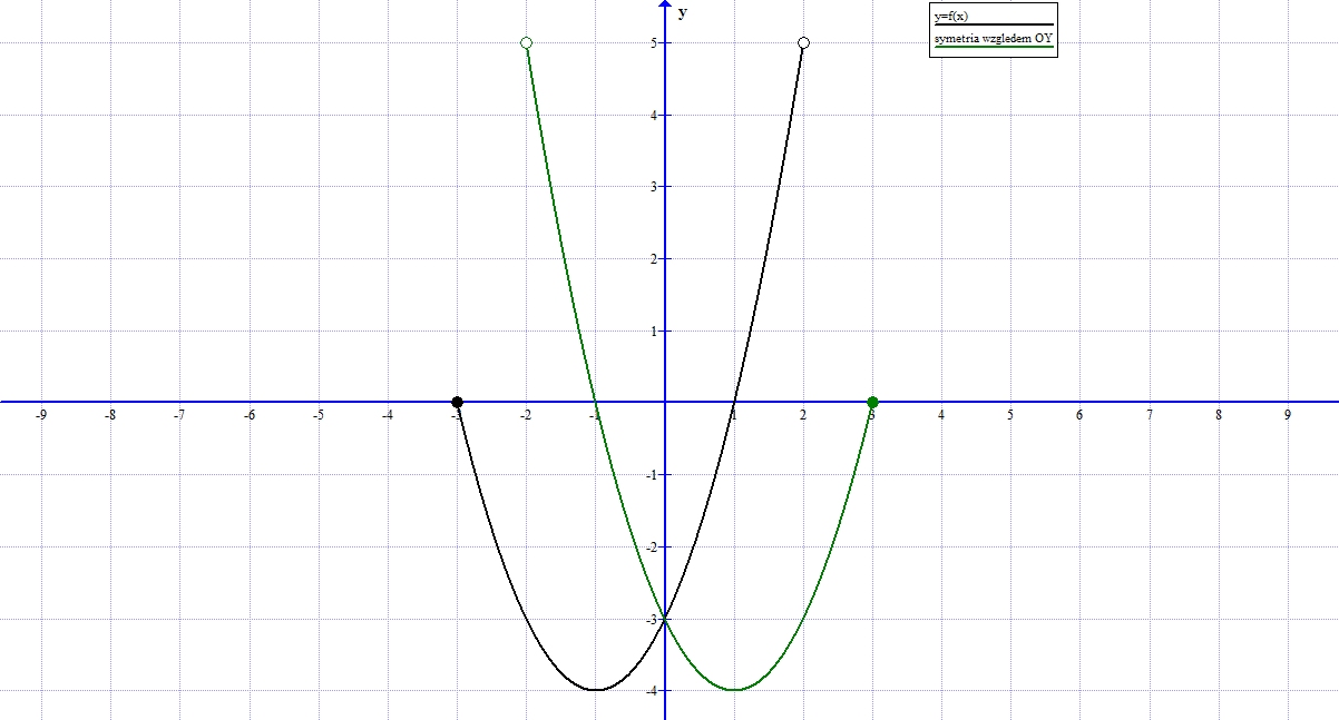 dziedziną funkcji f jest zbiór <-3,2) wykres funkcji f przekształcono przez symetrię osiową względem osi OY i otrzymano wykres funkcji g dziedziną funkcji g jest zbiór
