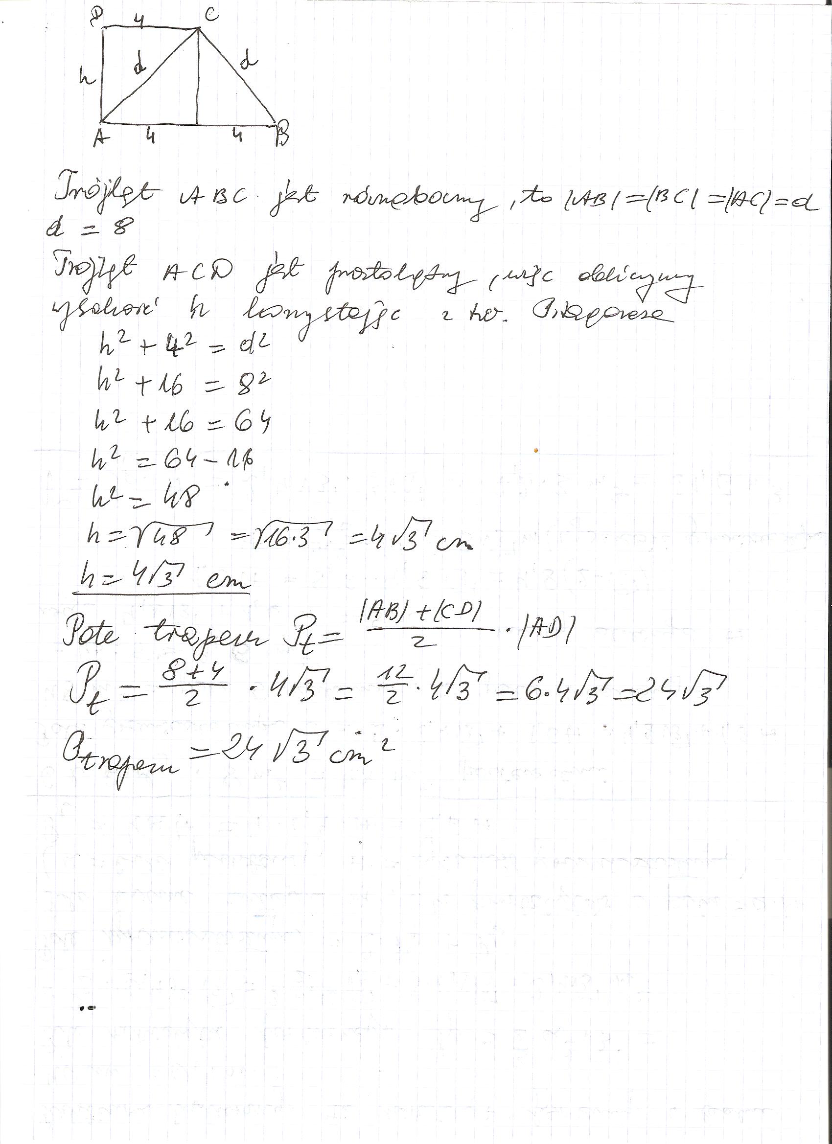 Krótsza podstawa trapezu prostokątnego ma dlugość 4 . Oblicz pole tego trapezu wiedząc , że jego krótsza przekątna dzieli trapez na dwa trójkąty z których jeden jest równoboczny