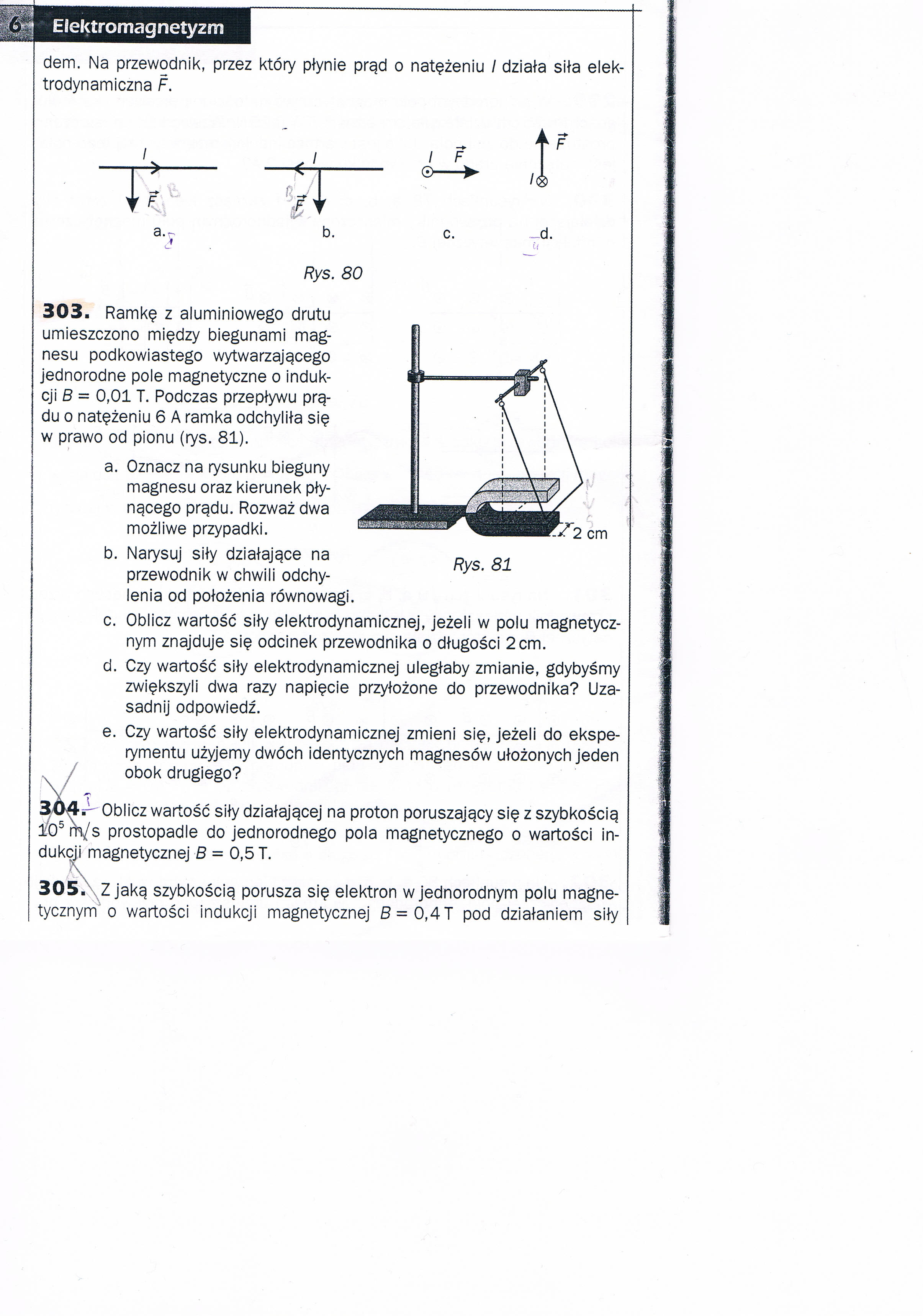 1. Na dole jest N, na górze S. Wektor indukcji jest wtedy zwrócony w górę (od N do S). Zwrot siły Lorentza określa iloczyn wektorowy:
