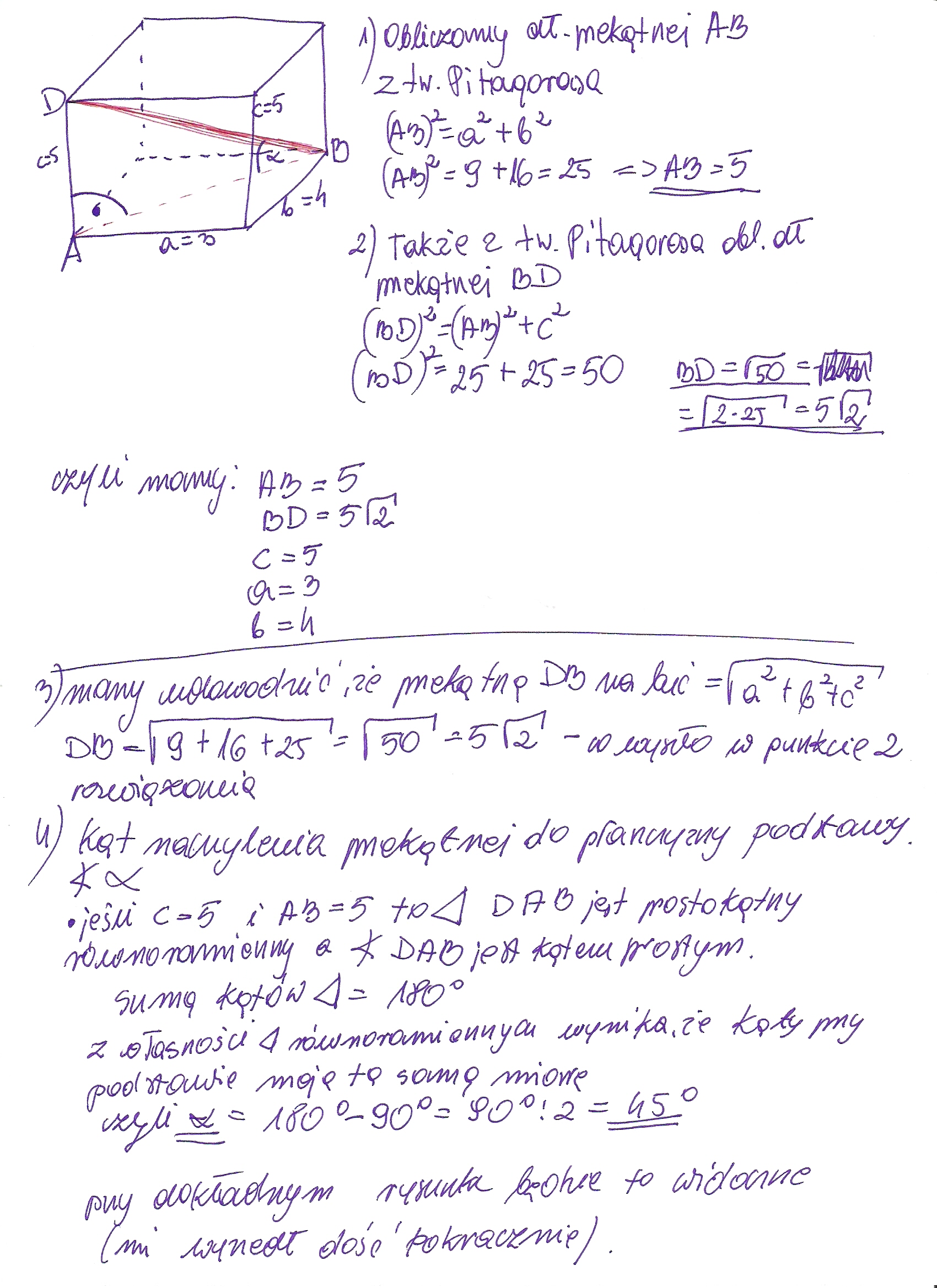 Dwukrotnie stosuje się tw. Pitagorasa. Najpierw do przekątnej podstawy o bokach a, b, co daje przekątną d równą: