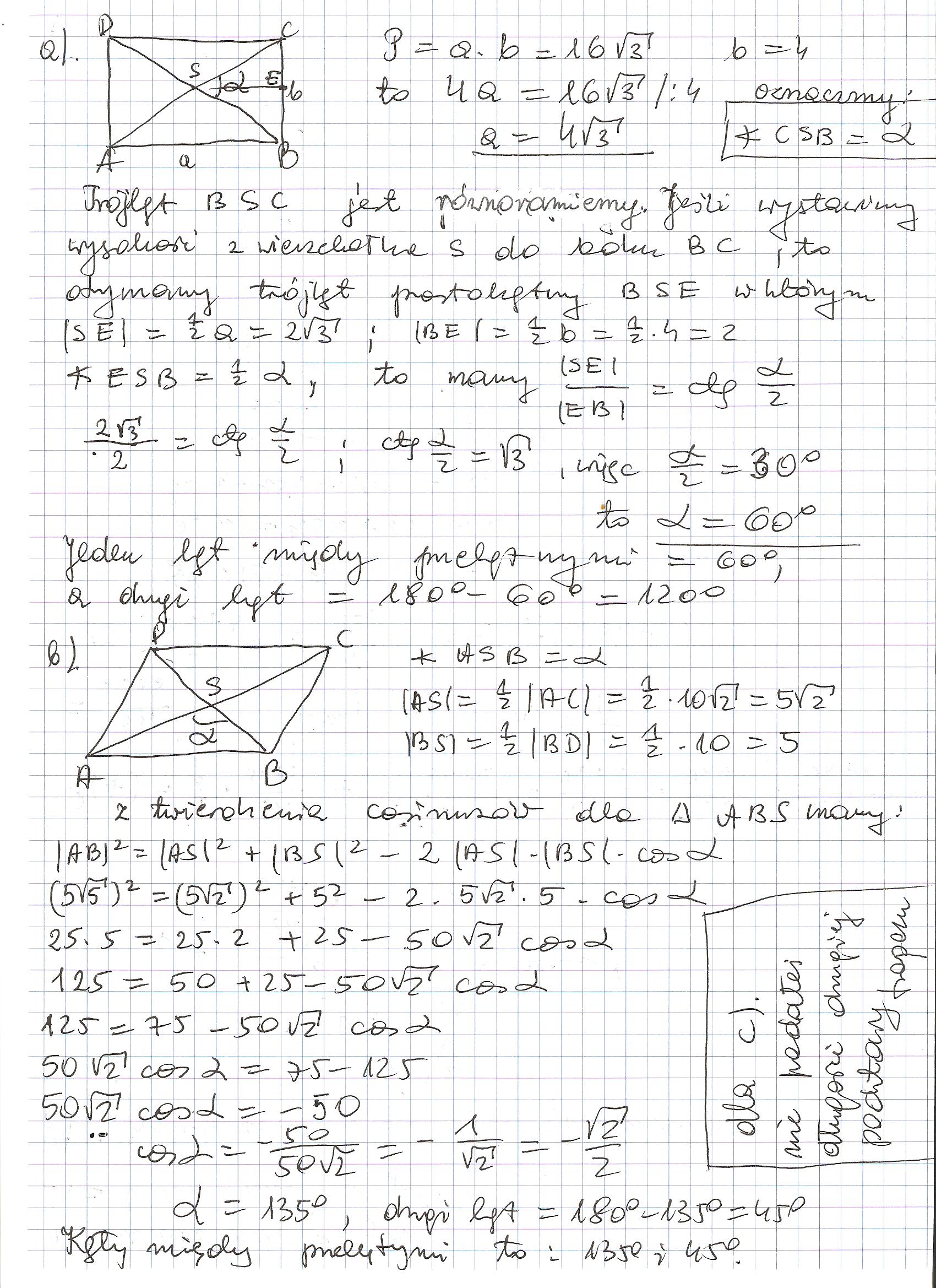 b) w równoległoboku, którego dłuższy bok ma długość 5pierwiastków z 5, wysokość poprowadzona na ten bok ma długość 2pierwiastków z 5 a długośc przekątnych wynosza 10pierwiastków z 2 oraz 10
