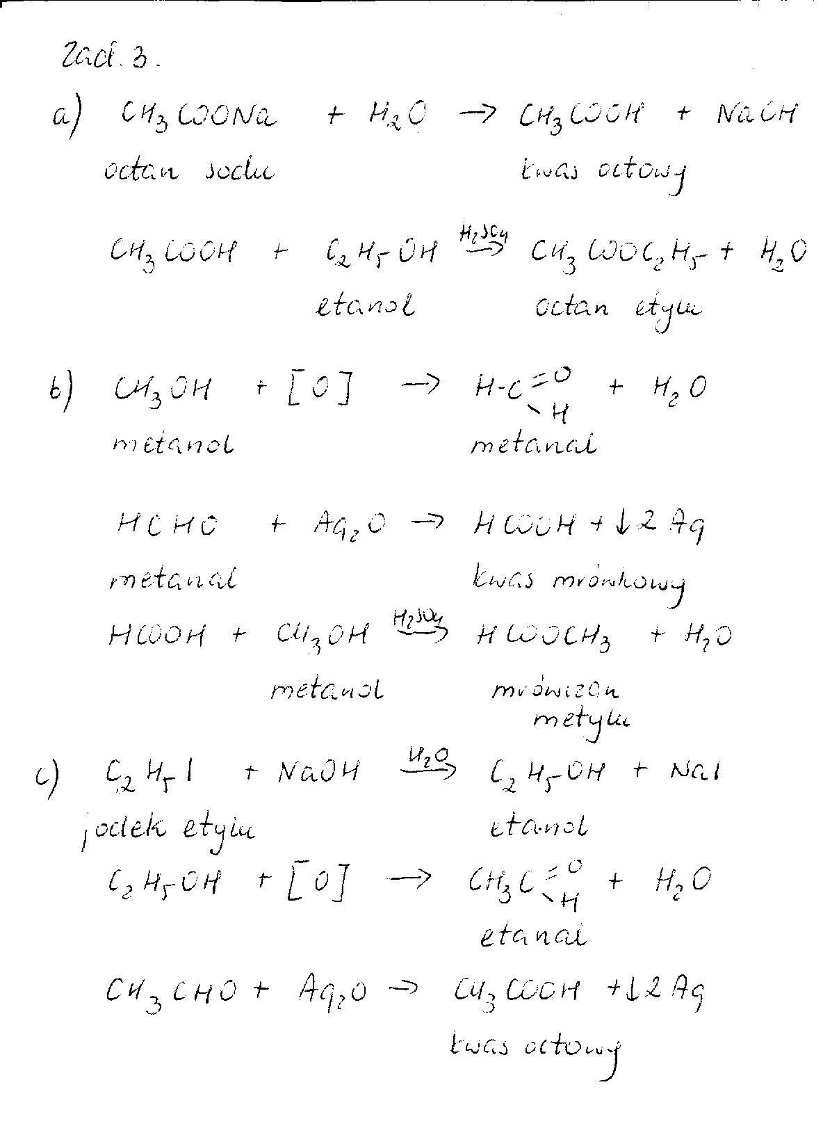 c) JODEK ETYLU -- > ETANOL -- > ETANAL -- > KWAS OCTOWY