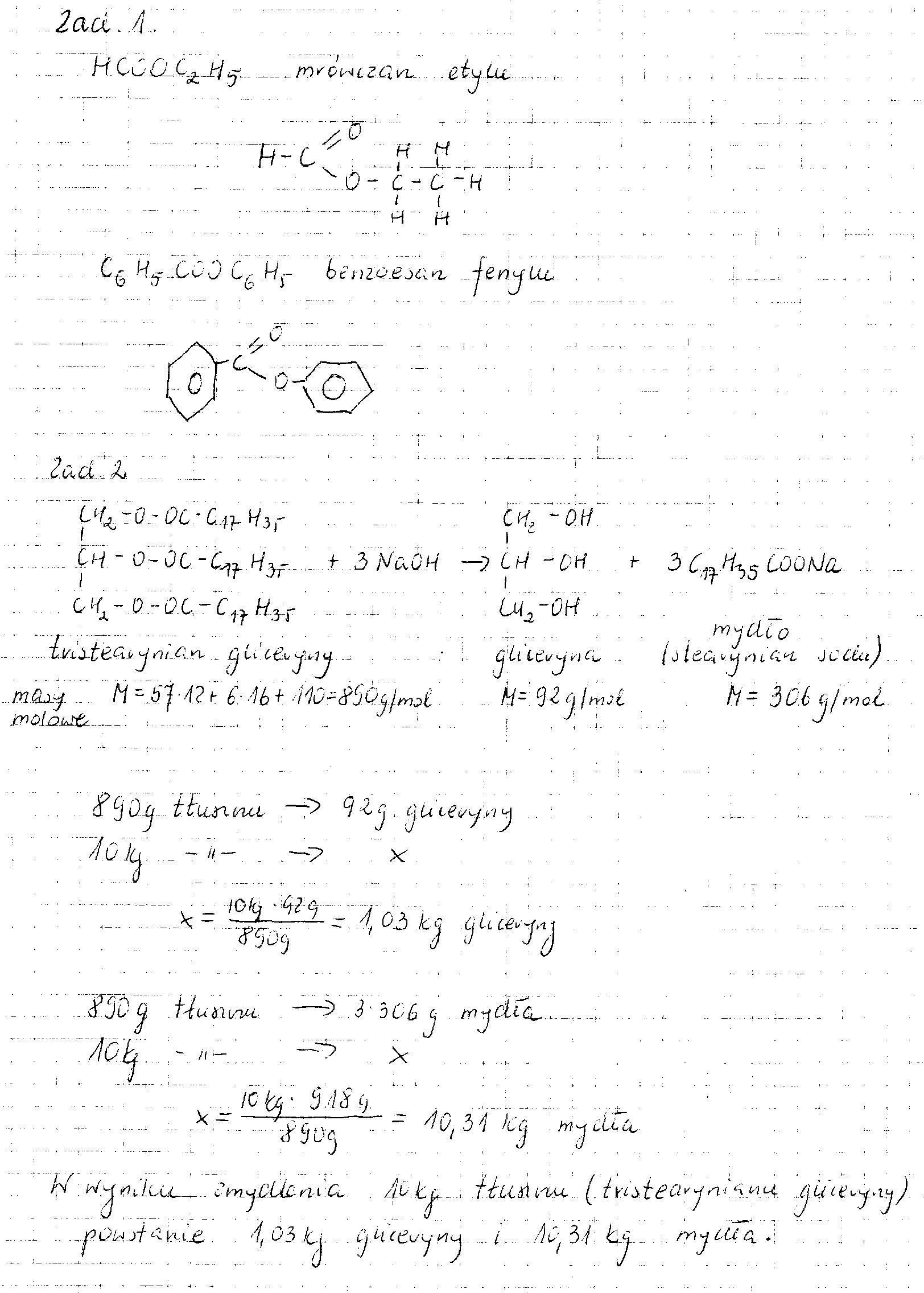 2. OBLICZ ILE KG MYDŁA I GLICERYNY POWSTANIE W WYNIKU ZMYDLENIA 10KG TRISTEARYNIANU GLICERYNY ROZTWOREM WODOROTLENKU SODU .