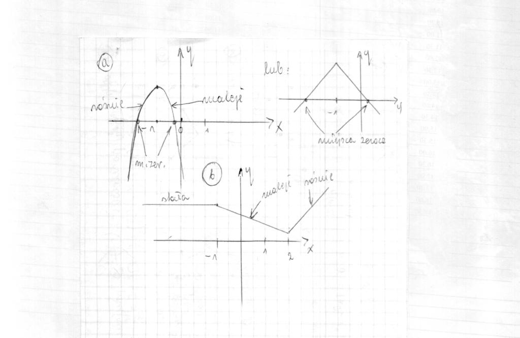 b) nie ma miejsc zerowych, jest rosnąca w przedziale <2;~), malejąca w przedziale <-1;2> oraz stała w przedziale (-~;-1>