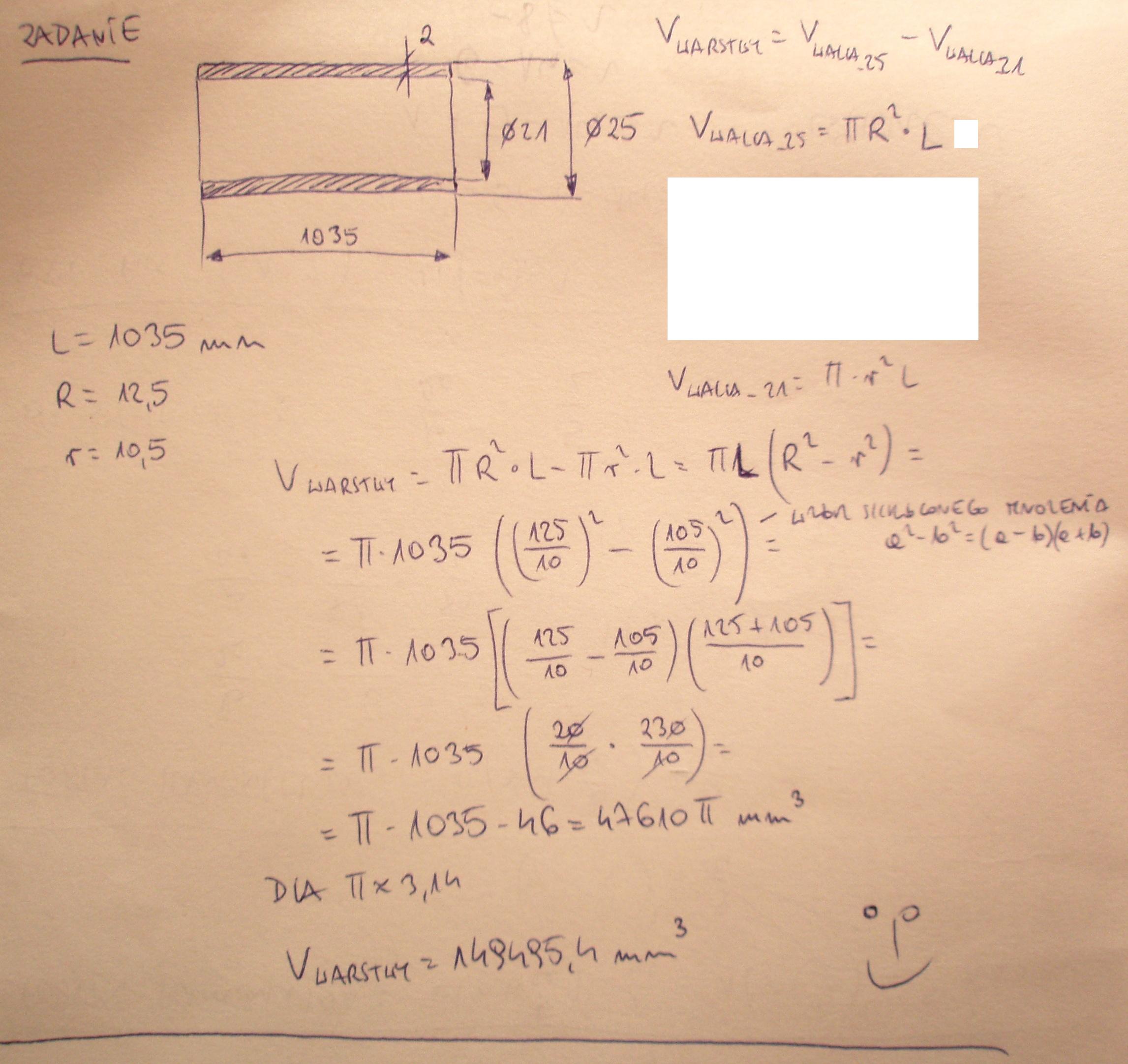 Cylindryczny wał maszyny o długości 1035 mm i średnicy 21 mm pokryto warstwą syntetycznego kauczuku o grubości 2mm.Oblicz objętość tej warstwy.