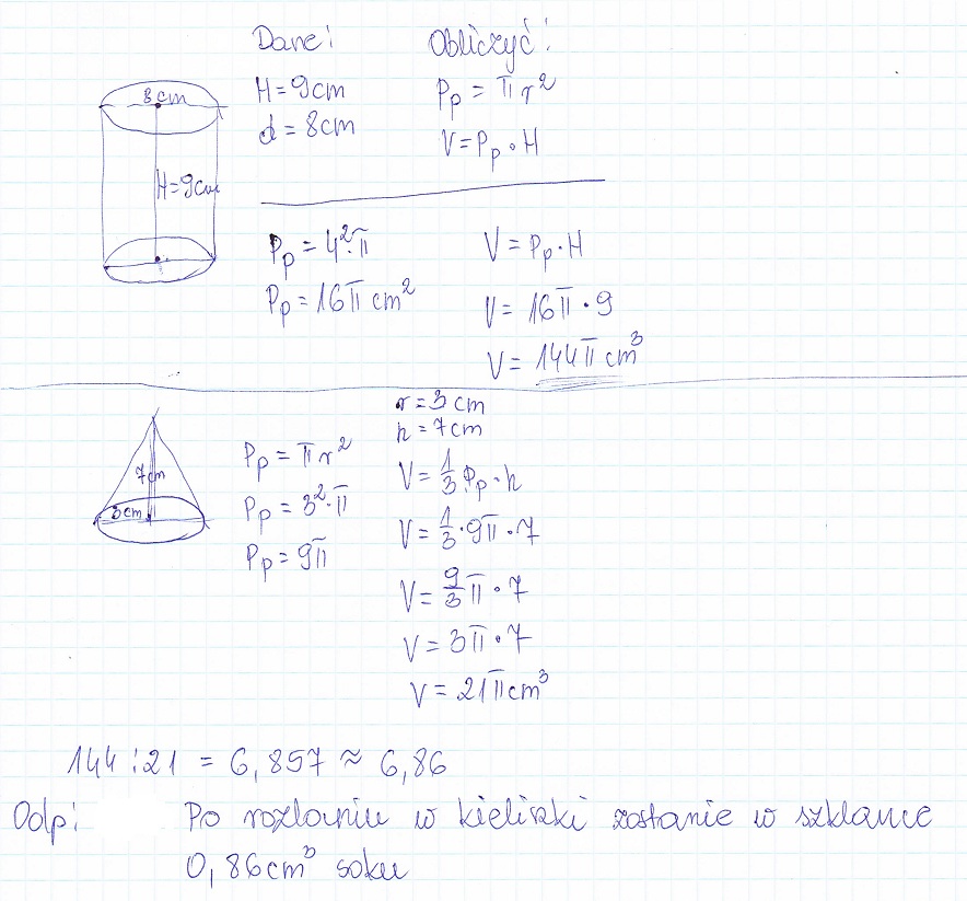 szklanka ma kształt walca o średnicy8cm i wysokości9cm i jest napełniona całkowicie sokiem. Sok przelewamy do6kieliszków w kształcie odwróconego stożka o promieniu3cm i wysokości7cm.Oblicz ile soku zostanie lub zabraknie jeśli w kieliszki chcemy wlać sok do pełna.