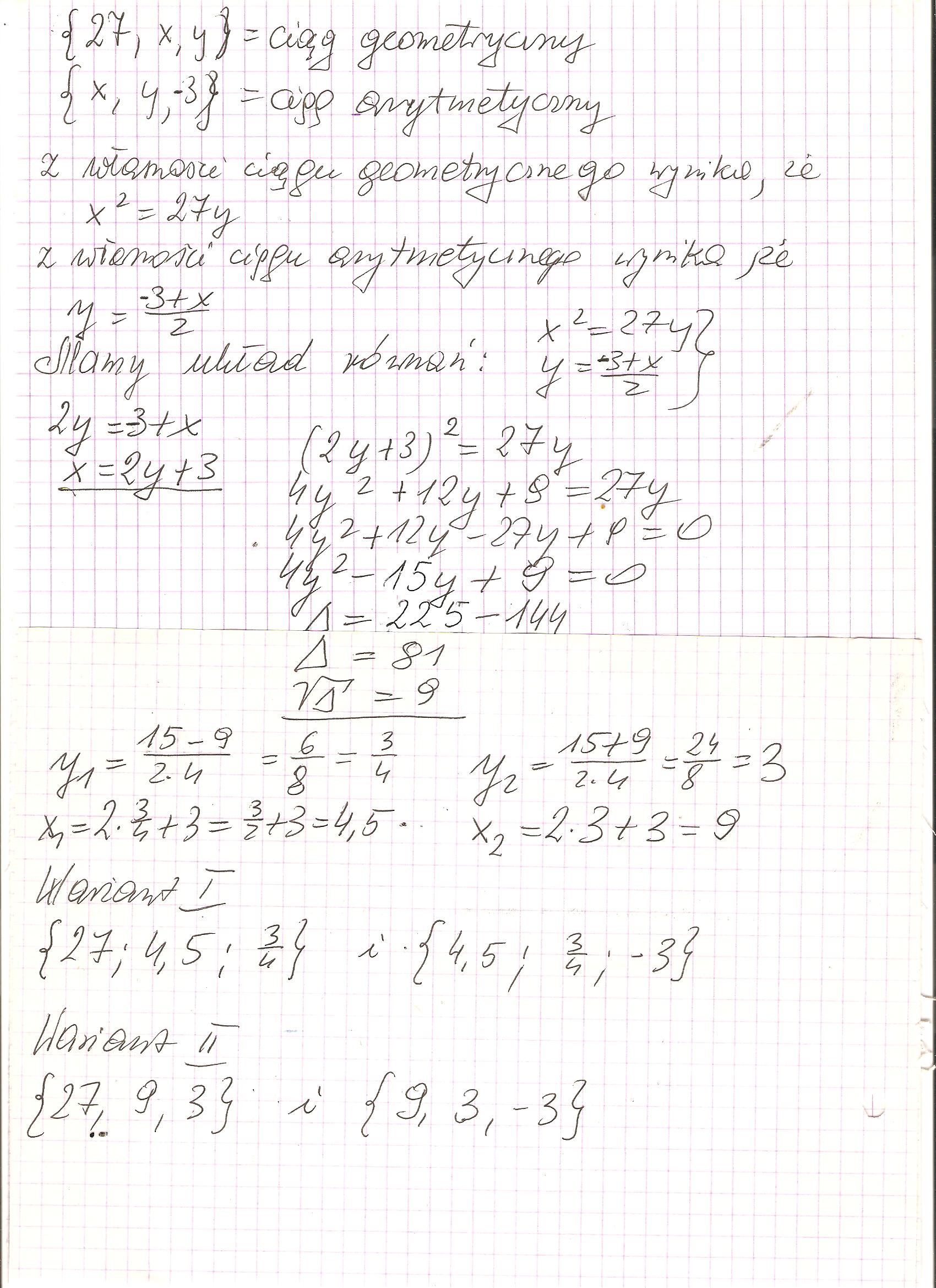 wskaż takie liczby x i y,aby ciąg27,x,y był geometryczny,a ciąg x,y,3arytmetyczny