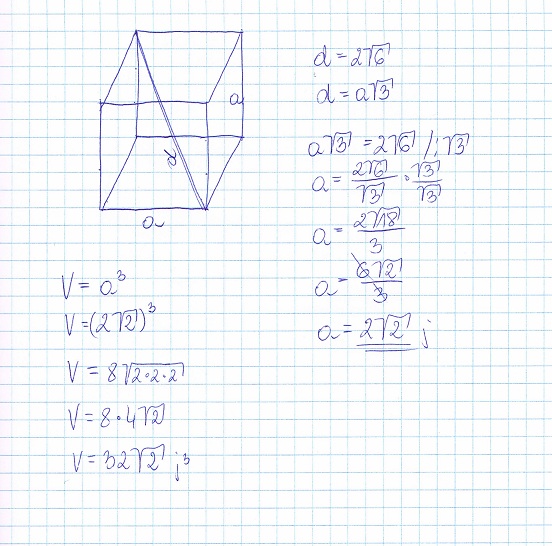 Przekatna szescianu ma dlugosc 2pierwiastek6. Objetosc tego szescianu wynosi?