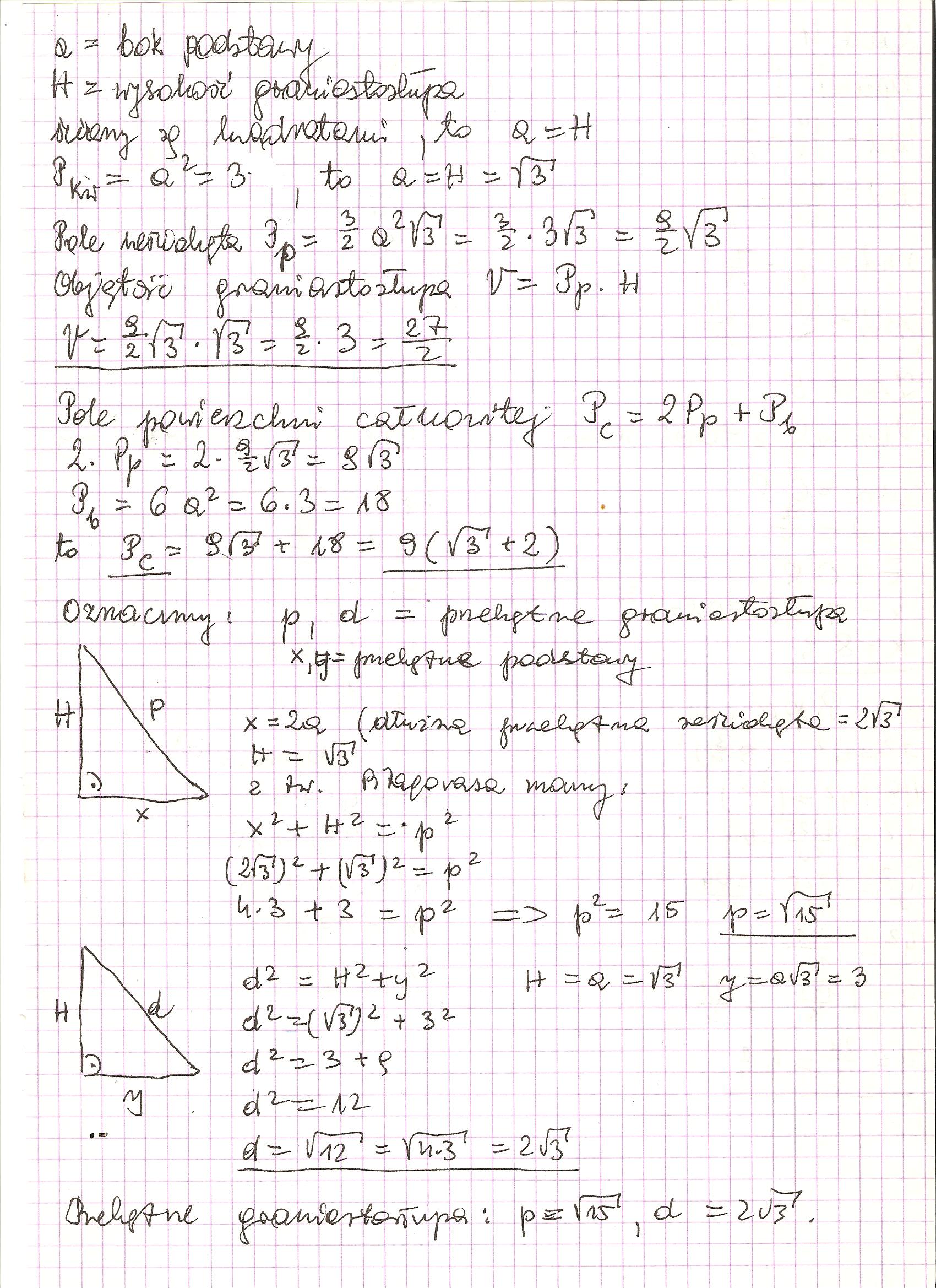 Ściany boczne graniastosłupa prawidłowego sześciokątnego są kwadratami o polu powierzchni równym 3.Oblicz objętości pole powierzchni całkowitej tego graniastosłupa.