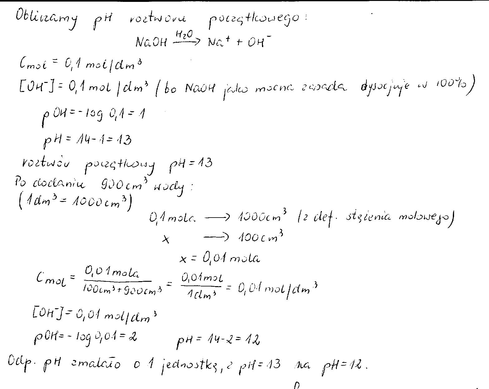 Do 100 cm3 0,1 molowego roztworu NaOH dodano 900 cm3 wody. Ustal jak zmieniło się pH roztworu.