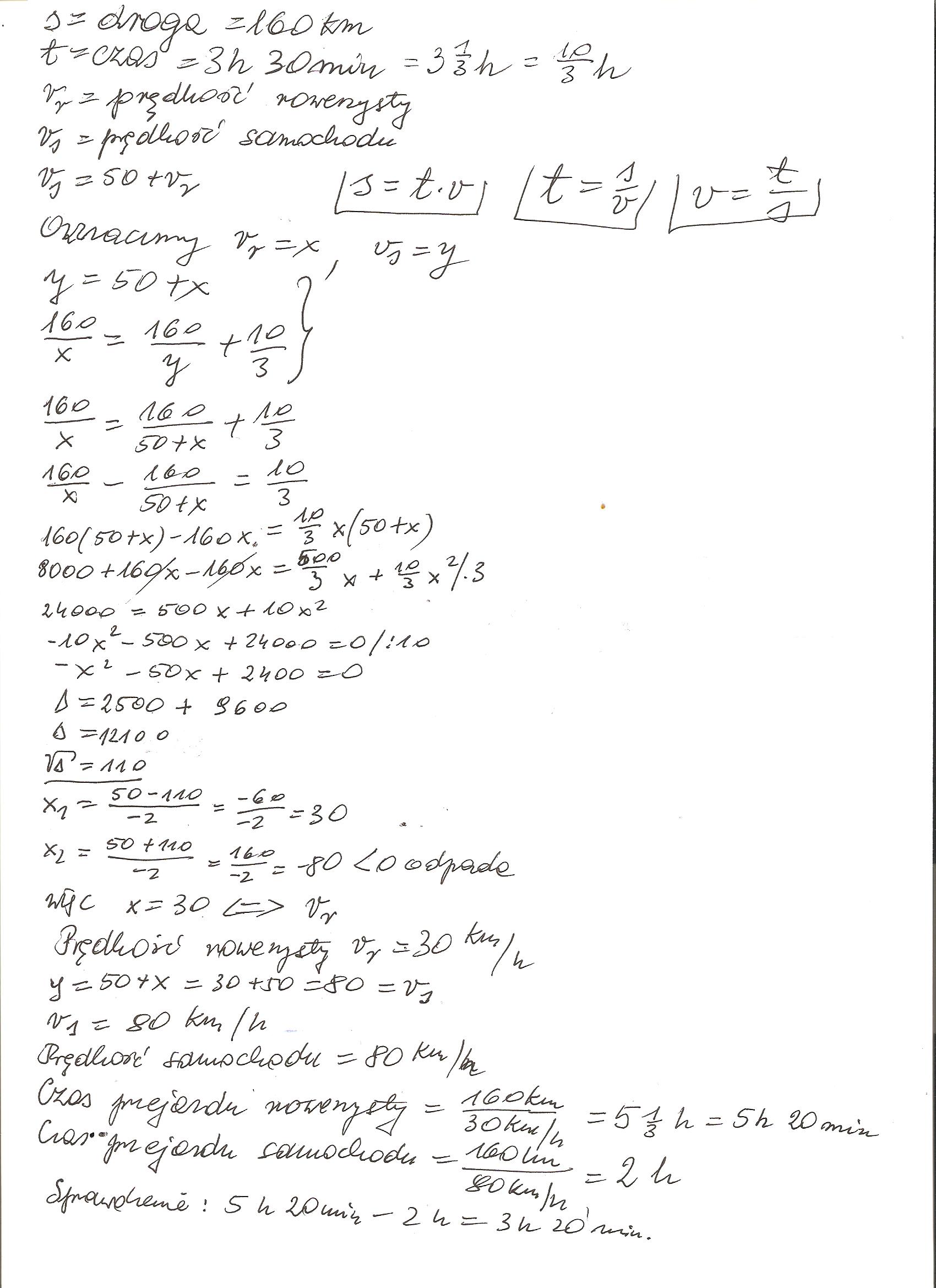 Z miejscowości A do miejscowości B odległej od A o 160km wyruszyły samochód osobowy i rowerzysta. Predkość rowerzysty jest o 50 km na godz. mniejsza od predkości samochodu. Czas przejazdu samochodu jest o 3 godz i 20 min krótszy od czasu przejazdu rowerzysty. Oblicz średnie prędkości samochodu i rowerzysty?
