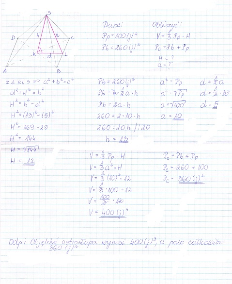 Oblicz objętość i pole całkowite ostrosłupa prawidłowego czworokątnego,którego pole podstawy wynosi 100 j^2