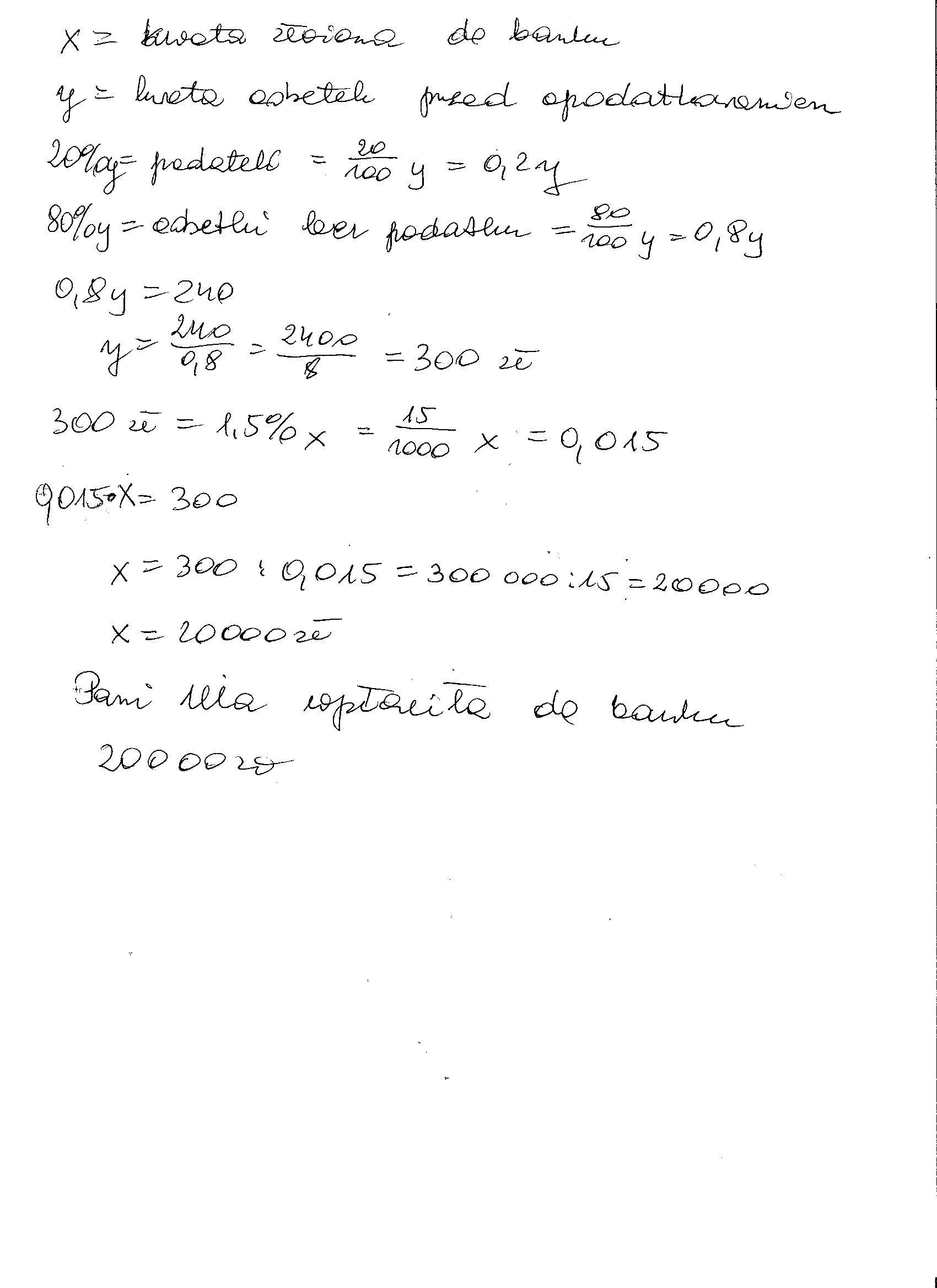 Pani Ula założyła w banku roczną lokatę oprocentowaną 1,5% w stosunku rocznym. Po roku, po uwzględnieniu 20% podatku, otrzymała 240zł odsetek. Jaką kwotę wpłaciła do banku?