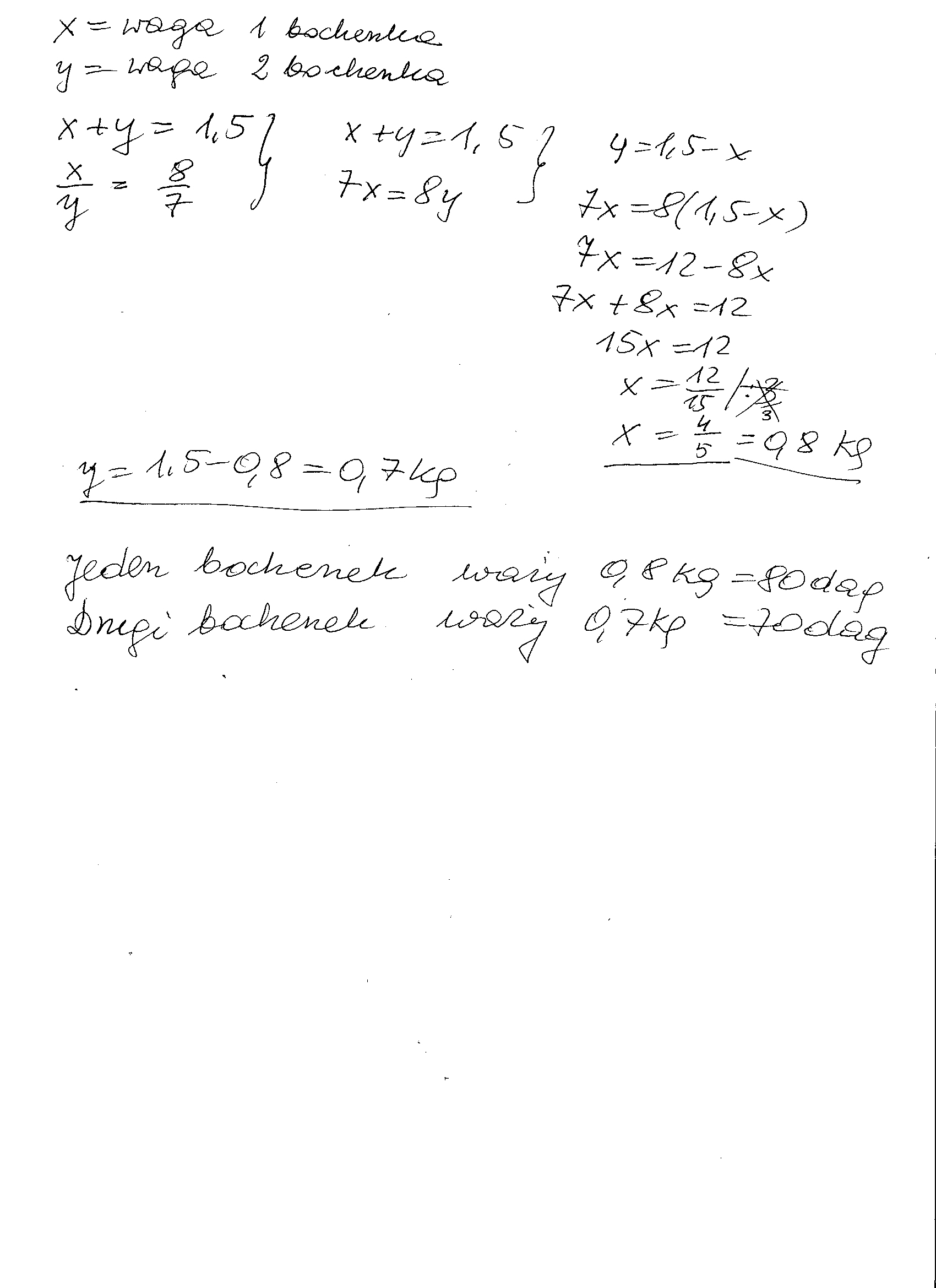 dwa bochenki chleba warzą 1,5kg, a stosunek mas tych chlebów jest równy 8/7.Ile warzy każdy bochenek chleba