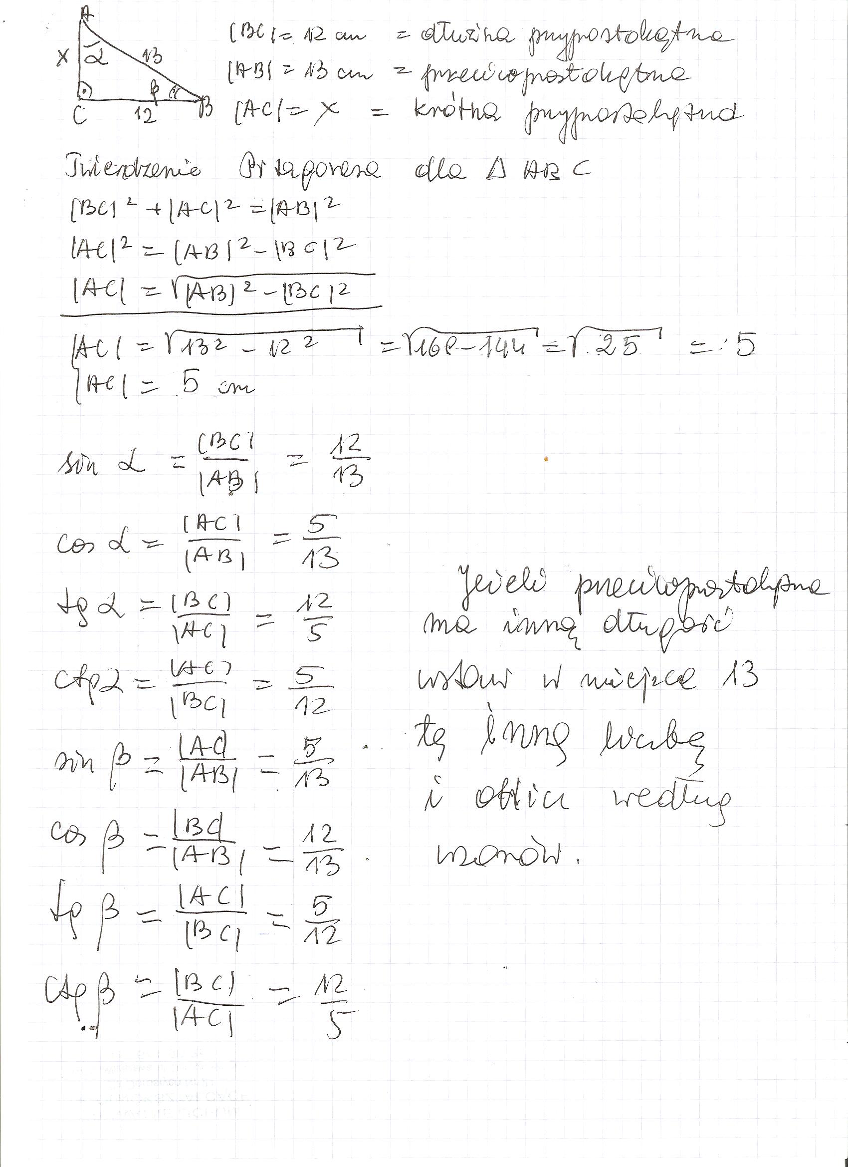 oblicz długość krótszej przyprostokątnej trójkąta prostokątnego, jeżeli dłuższa przyprostokątna ma 12 cm, a przeciwprostokątna ma 13cm Podaj wartości funkcji trygonometycznych ( sin , cos, tg, ctg) jednego kąta tego trójkąta