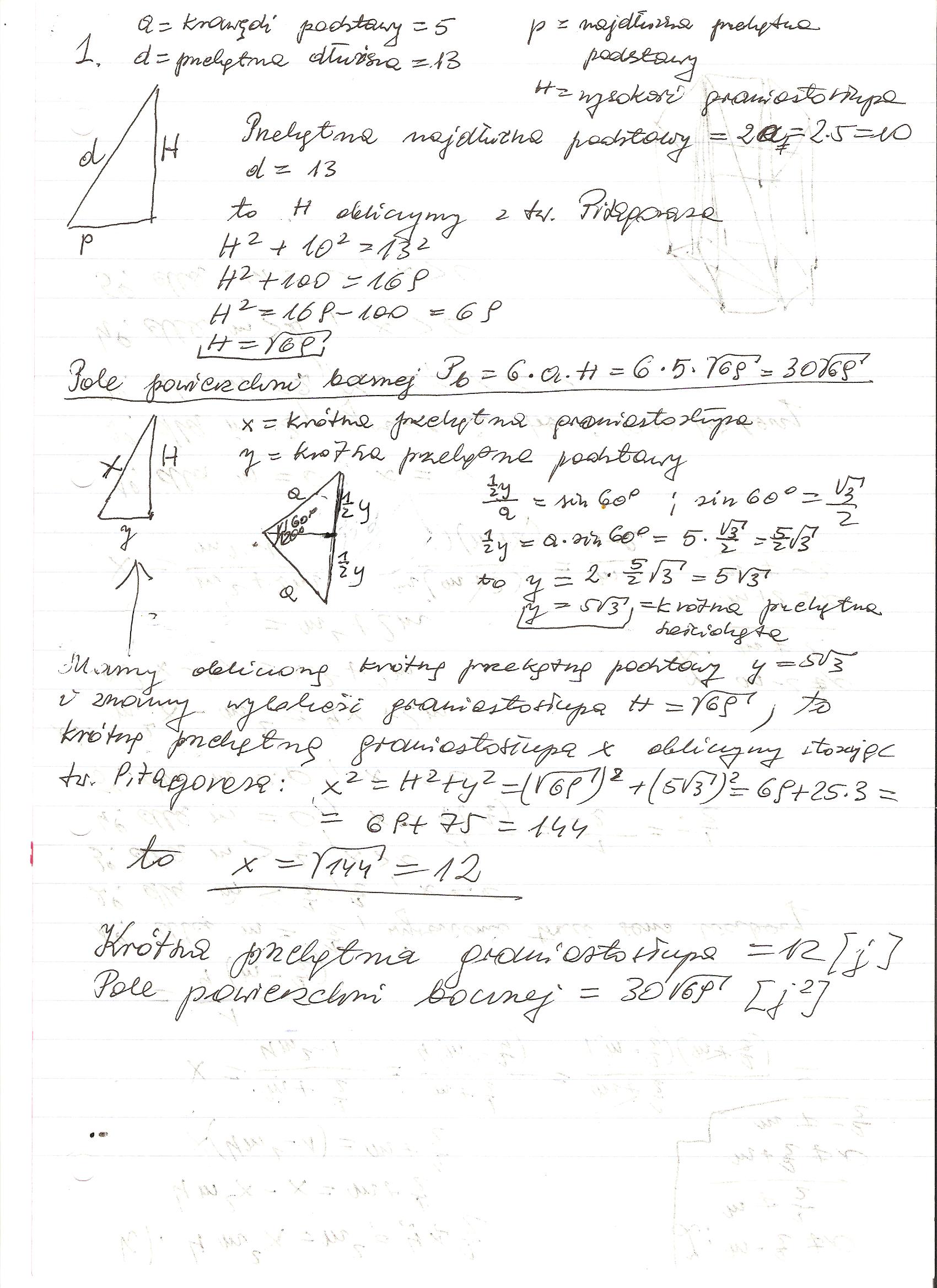 1.oblicz długość krótszej przekątnej i pole powierzchni bocznej prawidłowego graniastosłupa sześciokątnego, jeżeli długość jego najdłuższej przekątnej wynosi 13, a krawędzie podstawy mają długość 5