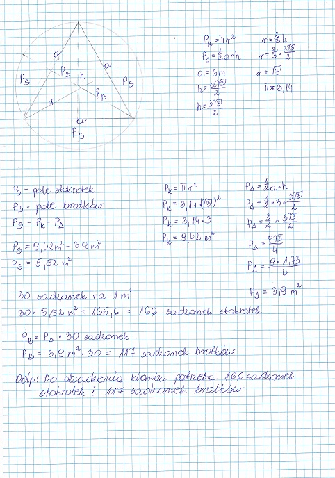 Klomb ma kształt koła opisanego na trójkącie równobocznym o boku 3m.Powierzchnia trójkąta ma być obsadzona bratkami, a pozostała część klombu stokrotkami.Ile co najmniej bratków, a ile stokrotek należy przygotować jeżeli na powierzchni 1m^2 mieści się 30 sadzonek.